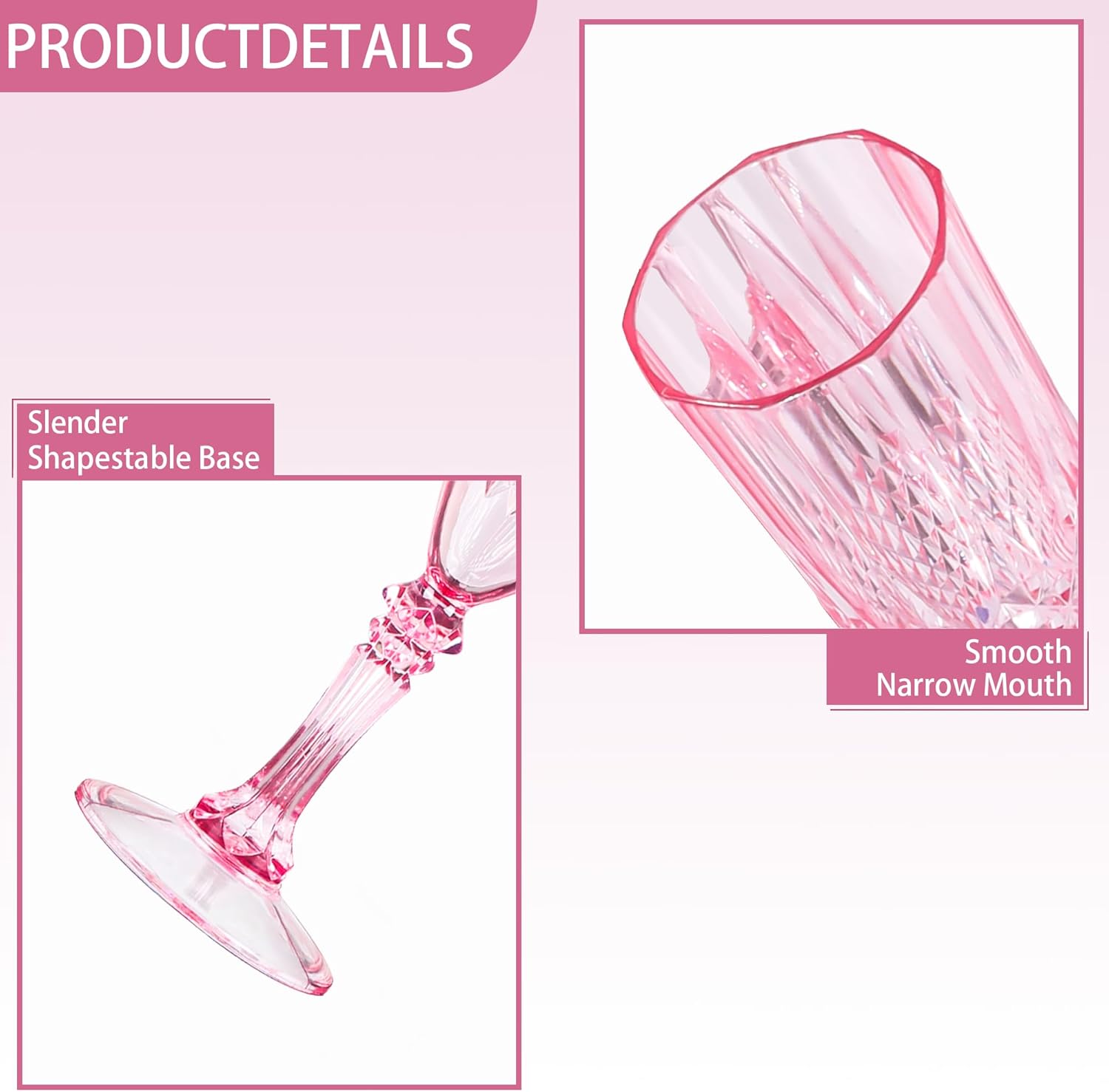 - Charming Set: Champagne flutes set include 24 retro-style pink champagne plastic wine glasses, providing ample quantity to meet your daily use and replacement needs. A suitable champagne cup is the icing on the cake. Plastic wine glasses not only carry the wine, but also carries the laughter and blessings