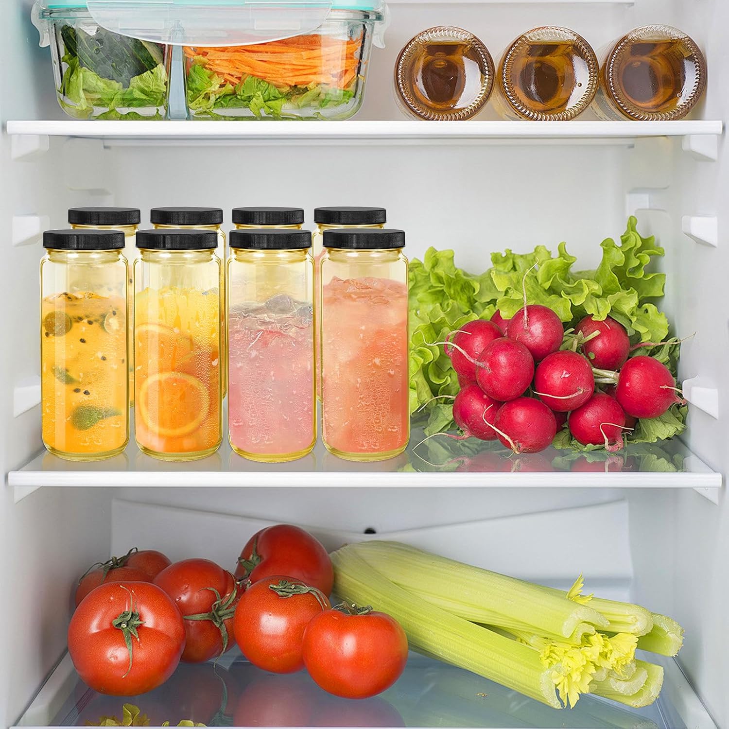 - Comprehensive Set for All Your Needs:The Ruckae 16oz 10 Pack Juice Bottles include everything you need for your juicing adventures.Each set features 10 glass juice bottles with lids,perfect for storing fresh juices,smoothies,and kombucha.With additional smoothie cups with lids and straws,you can enjoy your favorite beverages on the go!