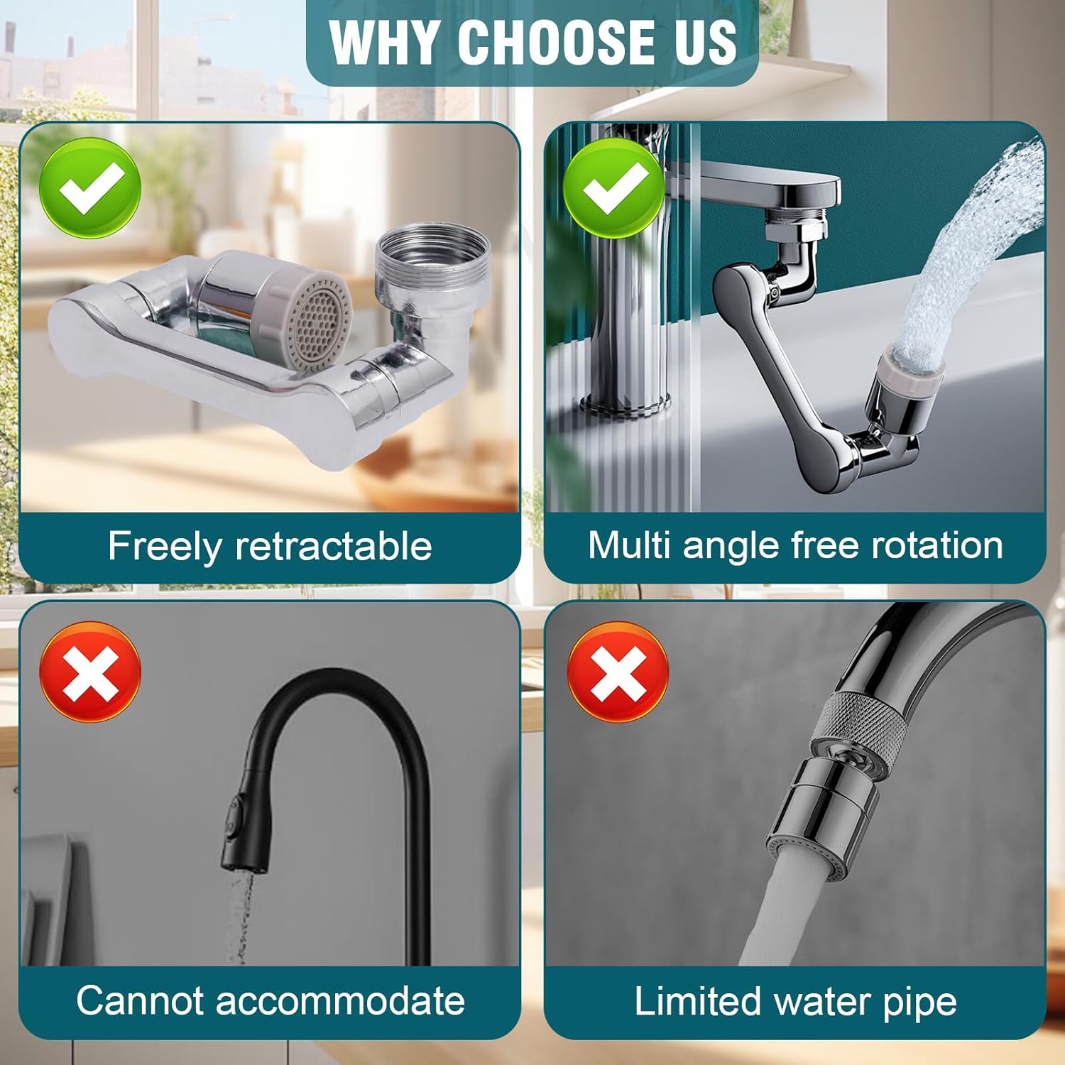 - 【Sink Faucet Extender Aerator】1080 Swivel robotic arm has 3 joints rotation at 360 degree. Effectively extension faucet water flow and raise water spout height, more convenient for tooth brushing, shaving and toddlers hands washing, especially for children, the aged, and long-hair women