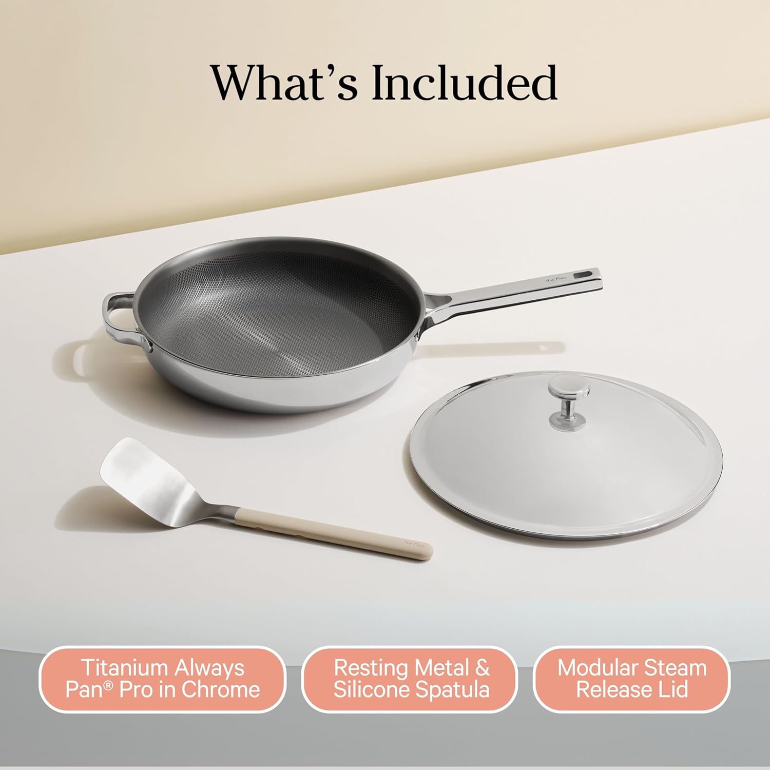 Our Place Titanium Always Pan Pro - 10.6” (2.8 Qt) No-Coating Nonstick Skillet | Tri-Ply Titanium & Stainless Steel | Safe for Oven, Induction & All Cooktops up to 1000°F | Includes Spatula | Chrome