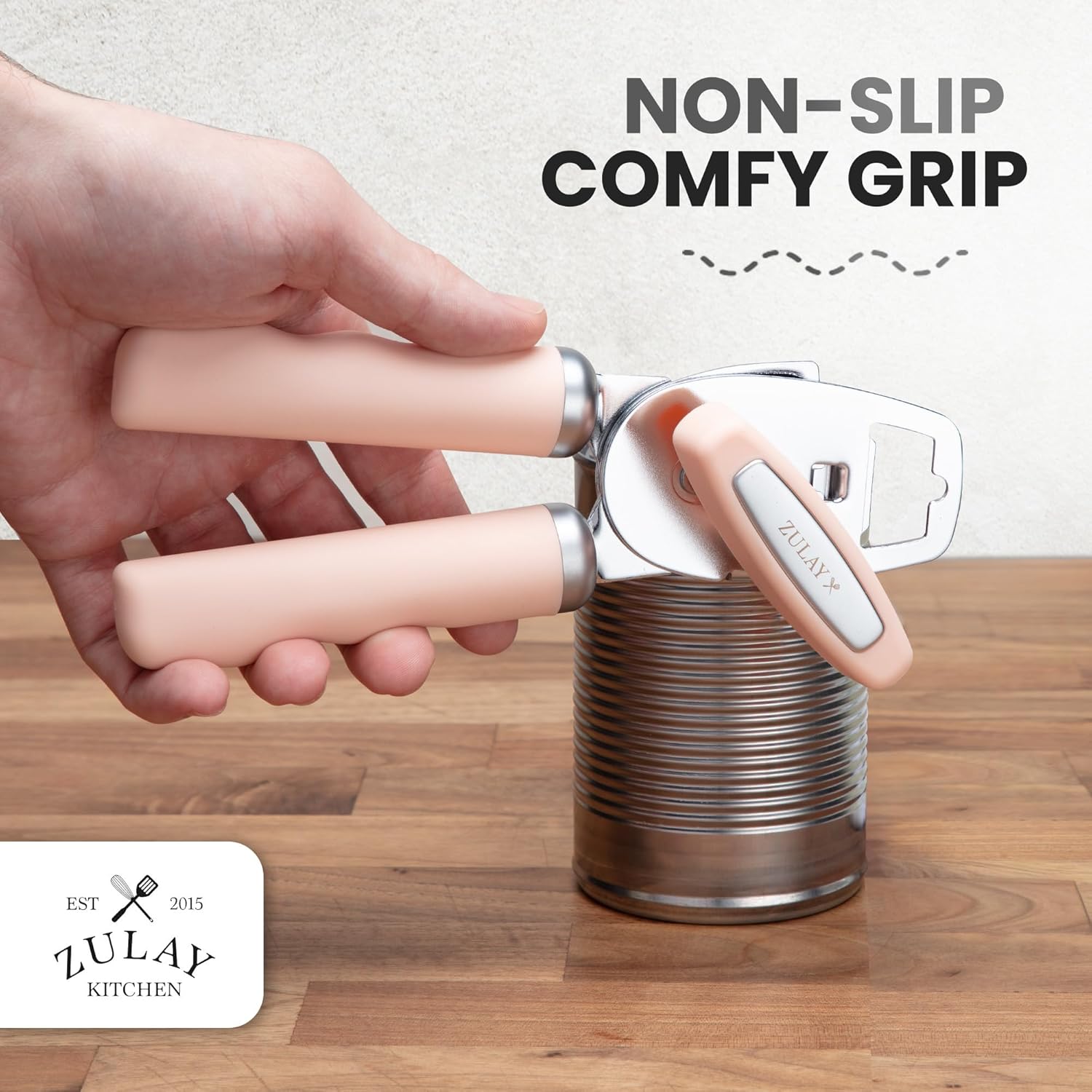 Zulay Kitchen Heavy Duty Stainless Steel Can Opener Manual with Bottle Opener - Rust Proof Manual Can Opener With Turn Knob & Comfy Soft Grip Handles - Peach