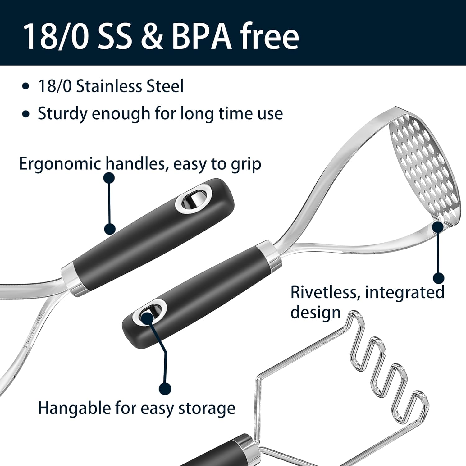 18/0 Stainless Steel Potato Mashers, 10.3-inch, Non-slip Handle, Kitchen Tool for Avocado Vegetable Sauce Butter Pumpkin Puree Bean, Dishwasher Safe, Pack of 2