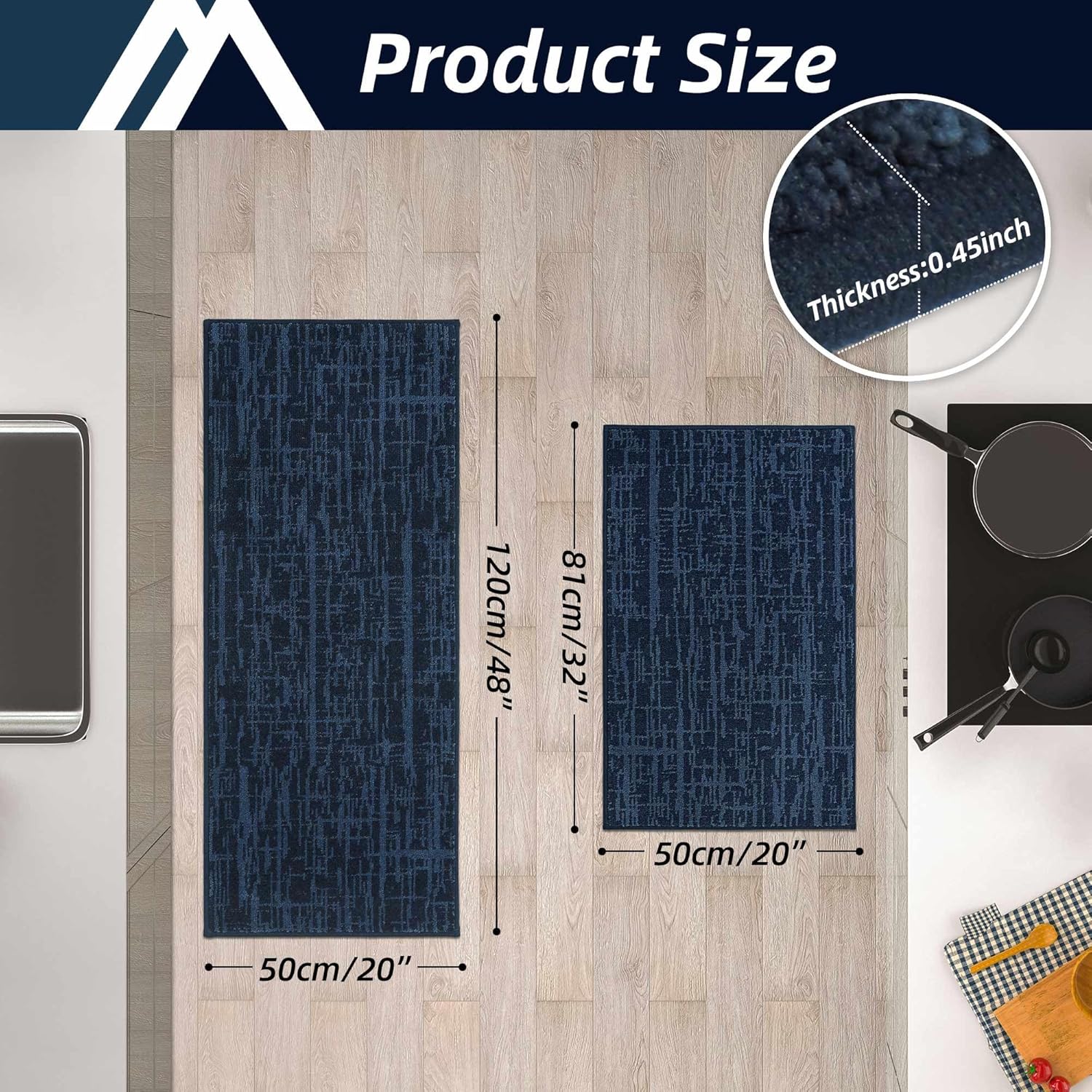 COSY HOMEER Kitchen Rugs 20"x32"+20"x48" Absorbent Soft Kitchen Mats for Floor Non Slip Kitchen Runner Rug Polyester Washable Kitchen Floor Mats for Sink Mat,Hallway,Laundry,Navy Blue