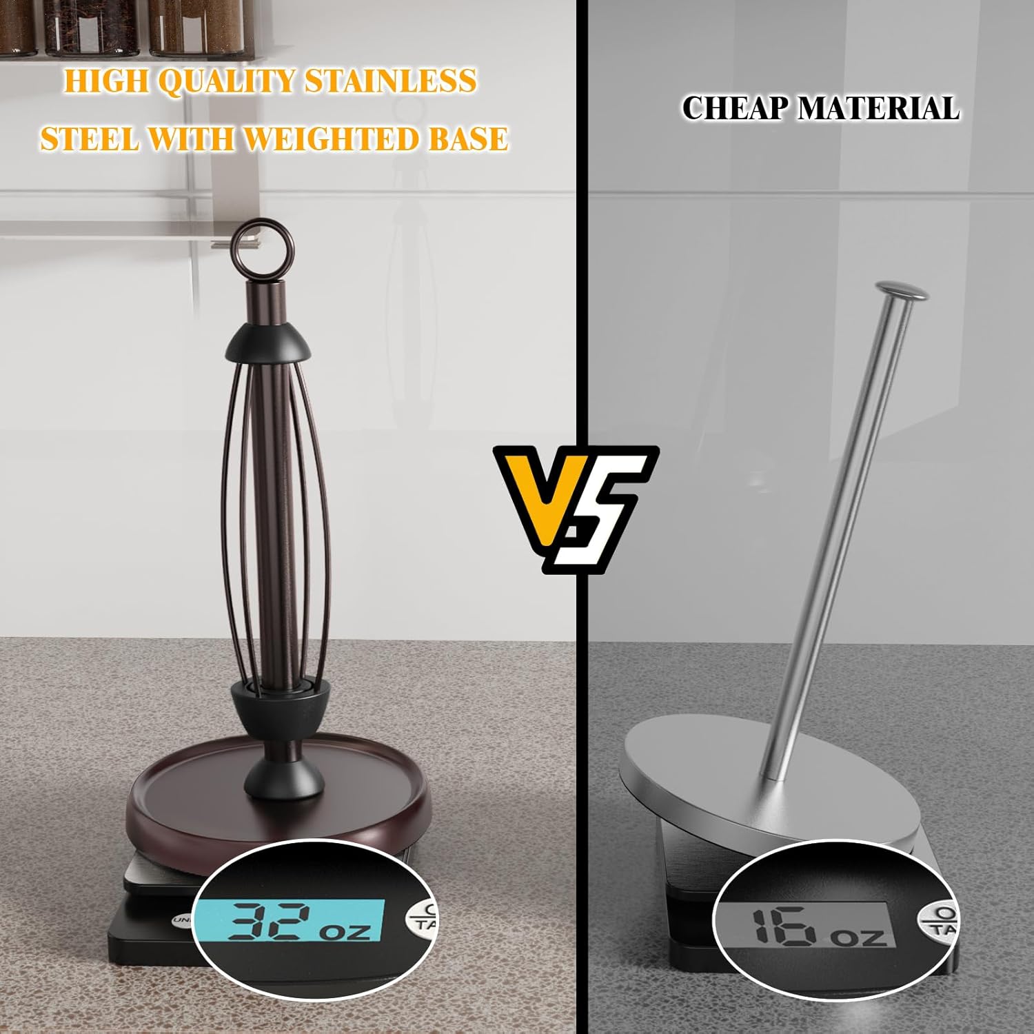- STUDY WEIGHTED BASE WITH NON-SLIP PAD: With weighted base to make sure that kitchen accessories rv paper towel holder won't shake when you tearing the paper. Non-slip EV pad at the bottom, won't scratch your desktop.