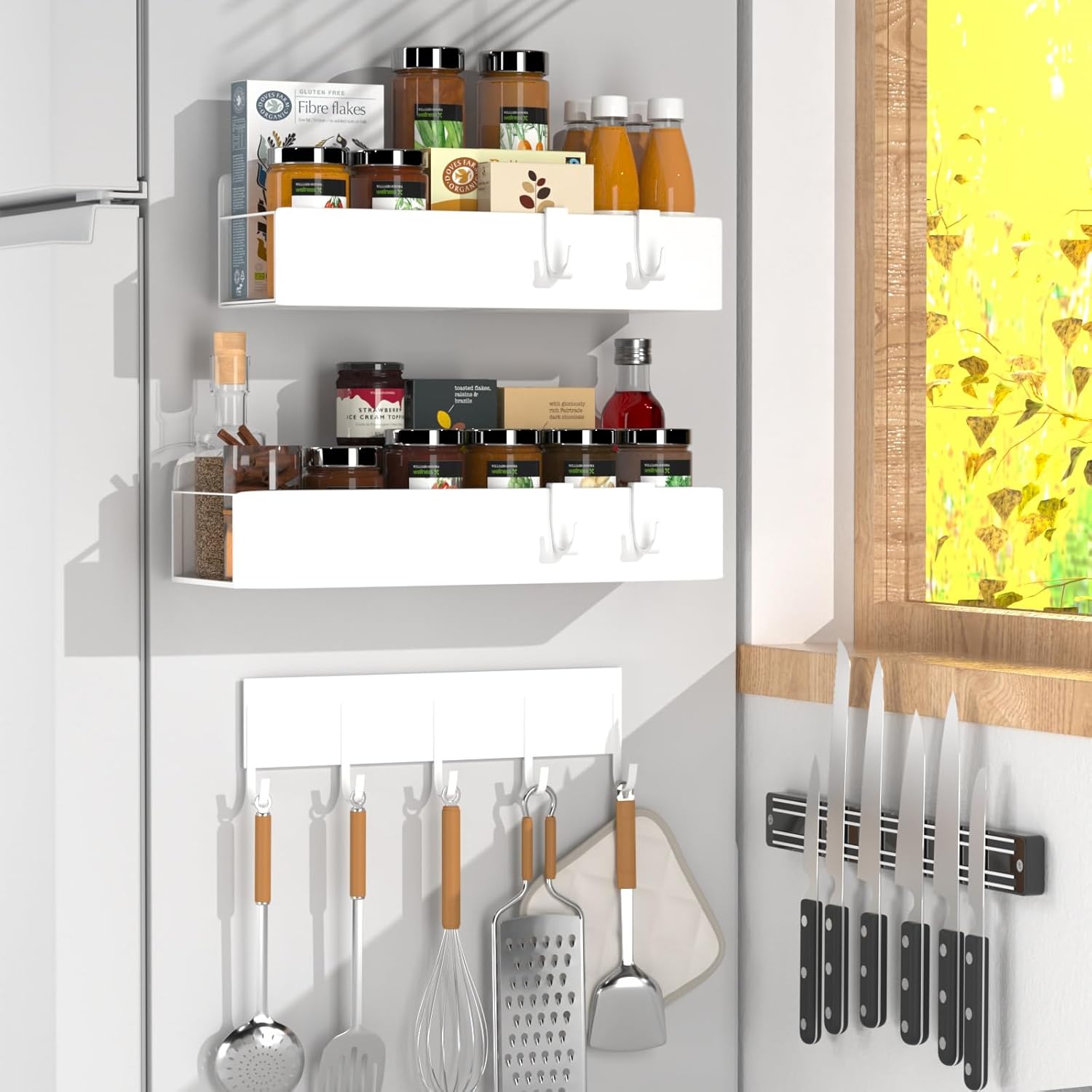 4 Pack Magnetic Spice Rack for Refrigerator,Metal Magnetic Shelf White with Hook,Magnetic Knife Rack,4 Hooks,Space Saving for Home,Kitchen