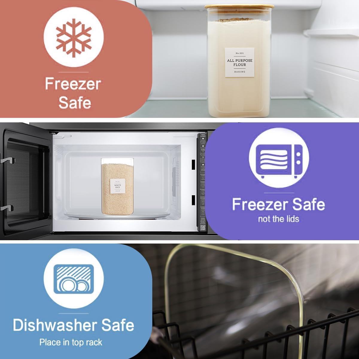 - 【DISHWASHER AND MICROWAVE SAFE】Heat-resistant up to 120°C, safely usable in microwaves for reheating. Compatible with freezers for versatile food storage. The large glass jar with lid is made of glass, and it is easy to wash, simply wash it under warm water or throw them in the dishwasher. The bamboo lid can be wiped with cloth.