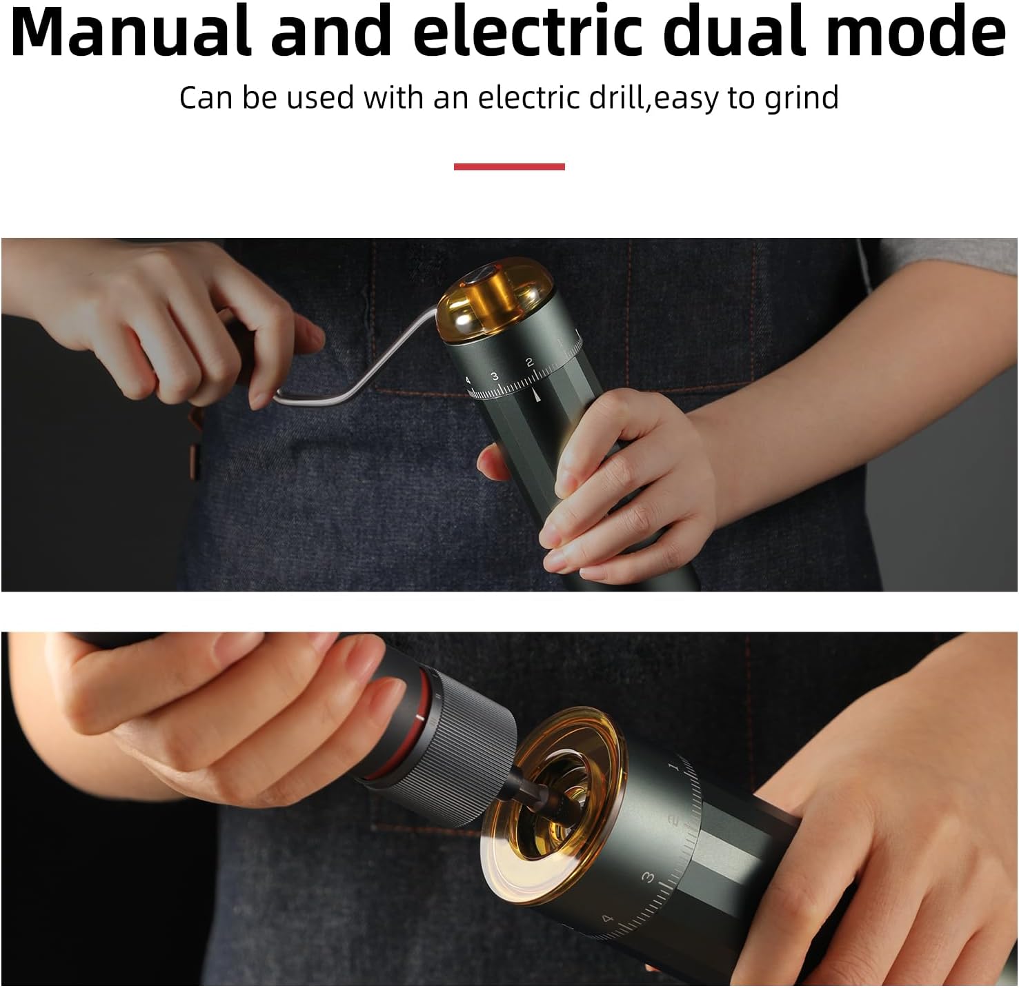 - 【EFFICIENT BURR】 - Z5 coffee bean grinder with 38mm seven axis titanium-plated conical burr that makes the grinding process more detailed and the coffee powder more uniform. Speed hand grinding only takes 35 seconds. Hand crank electric dual mode, can be used with electric drill to use electric mode.