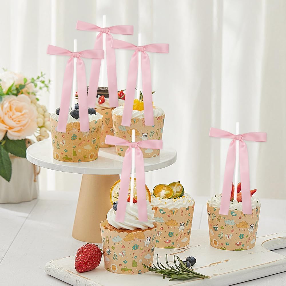 - THE PACKAGING CONTAINS: 10 PCS bow cupcake toppers, 10 PCS diamond needles. Insert the diamond needles into the middle of the bow to fix, and then decorate on your favorite cake. This makes your cake more interesting.