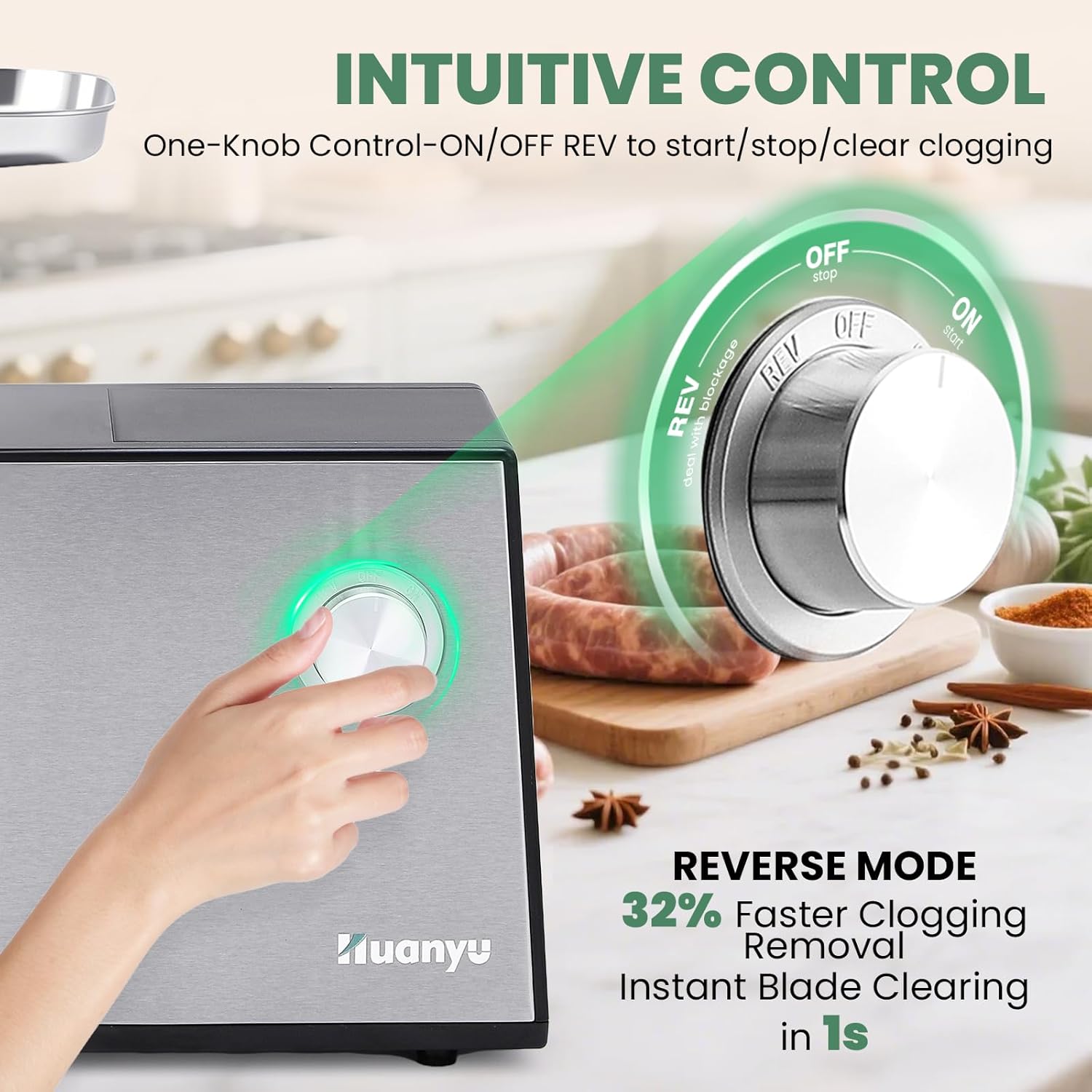 - [Intuitive control with reverse function] This heavy duty meat grinder Simplify grinding with a single knob (ON/OFF/REVERSE) — instantly clear jams by reversing the blade, ensuring smooth operation even with tough cuts