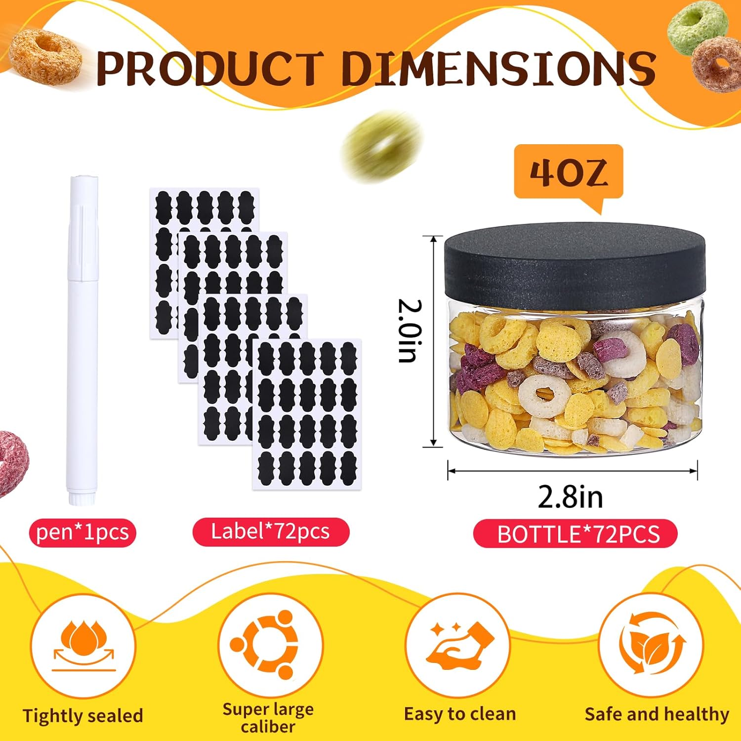 72pcs 4 oz Plastic Containers with Lids Labels Leak Proof BPA Free Airtight Refillable Clear Small Containers Storage Jars for Storing Dry Food Slime Honey Jam,black