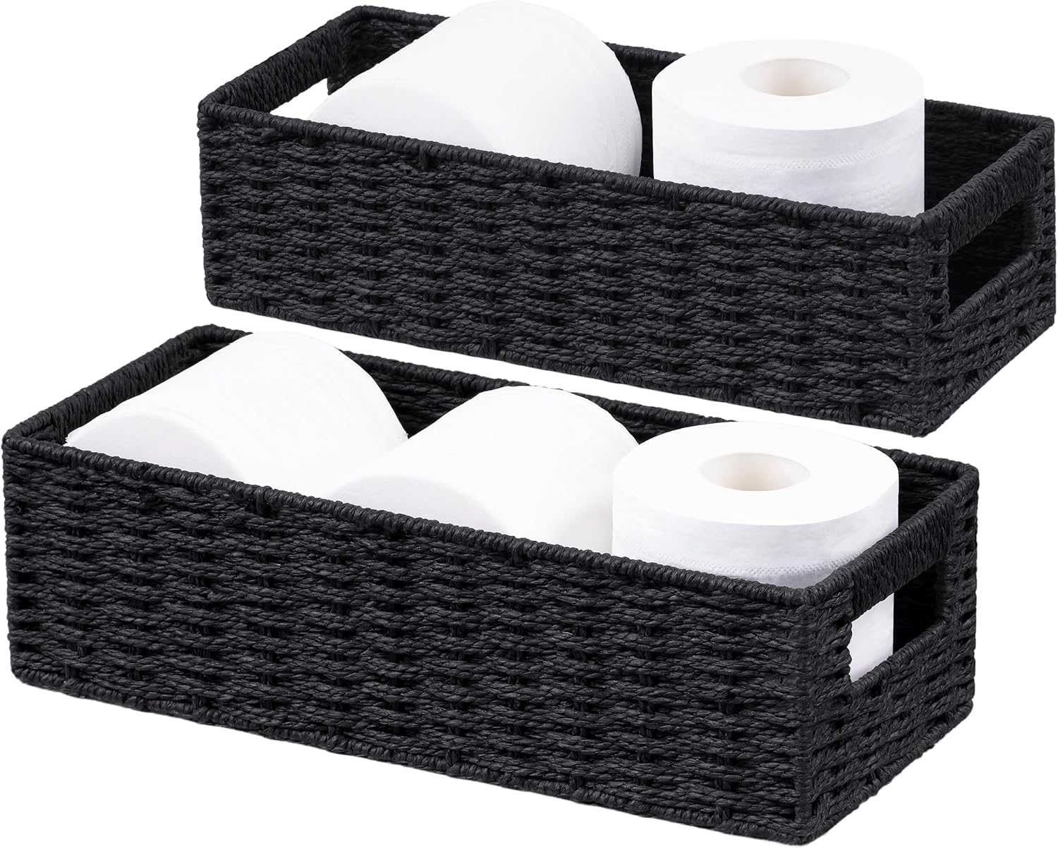 - Perfect size basket:2pack-13.97×6.1×3.9 and 13.18×5.31×3.54 basket is a perfect set for toilet tank paper storage, with enough capacity. The size of these storage bins fits many sizes of toilet paper rolls and is convenient for storing more daily necessities.