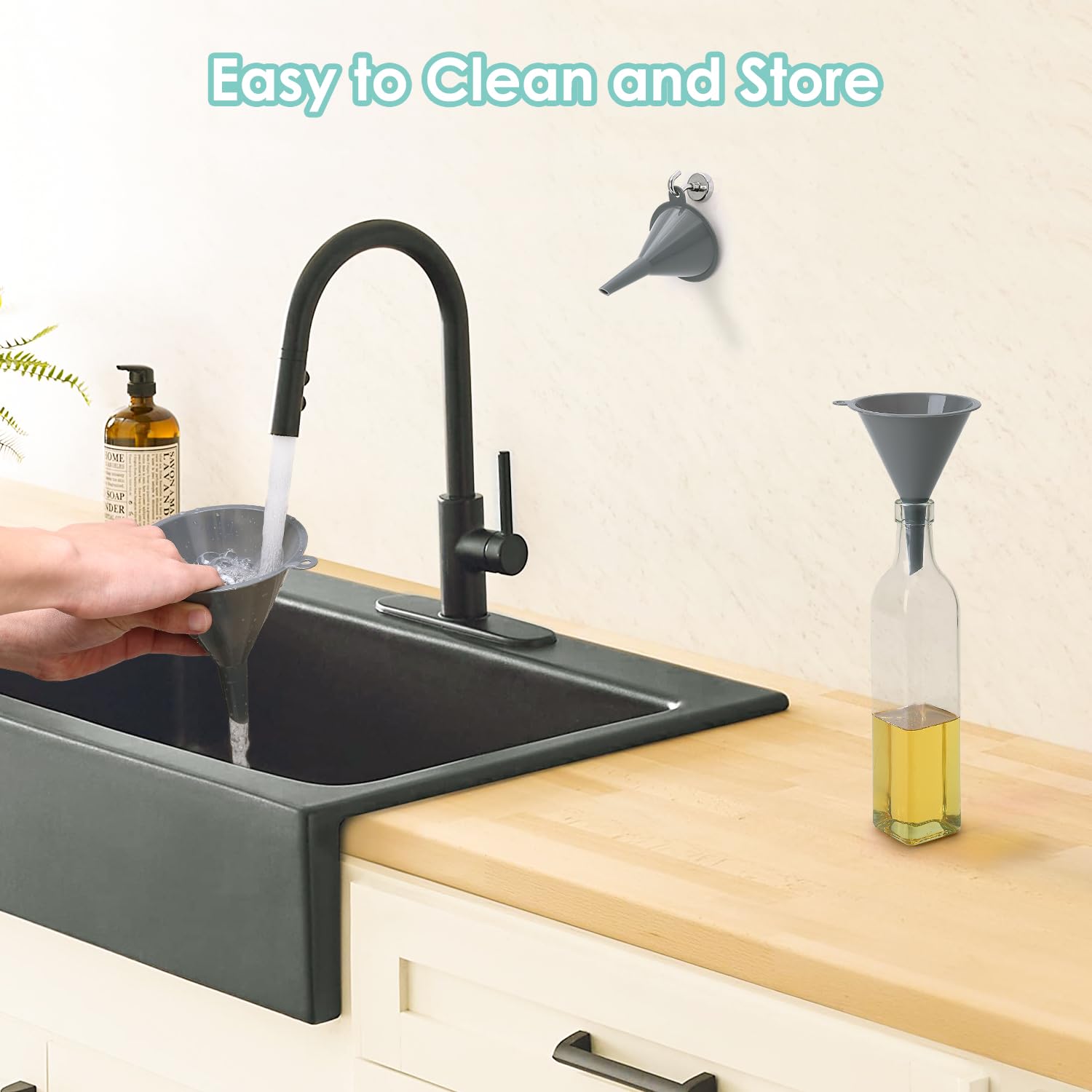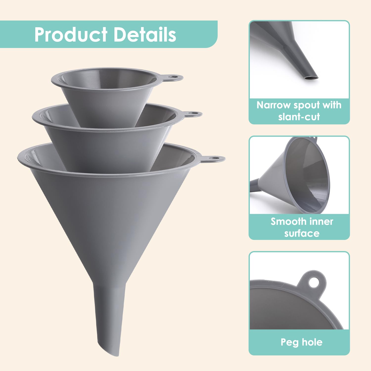 - Easy to Clean and Store: It has a convenient hole on one side, you can hang in garages, kitchens, or utility rooms when you don't need to use. Nesting funnels in different sizes, this funnel set can save space. It is easy to clean saving your time and hassle