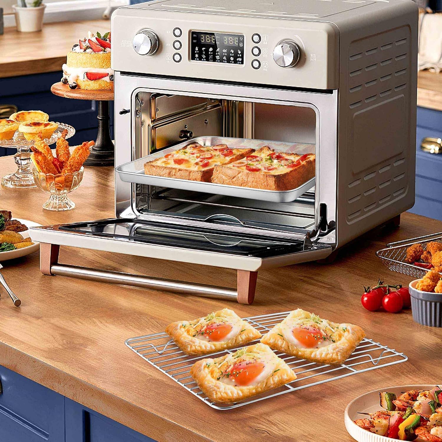 - Baking tray, nonstick bakeware set includes 1 cookie sheet pan 12.4" x 9.6" x 1" and 1 cooking rack 11.6" x 9.1", work perfectly together or shine in their respective fields, fits the most common oven, toaster oven and air fryer, big and deep to meet sweet or savory baking, ideal for toasting dinner as chicken, steak, serving vegetable, cookies and meats, make you enjoy your cooking baking journey