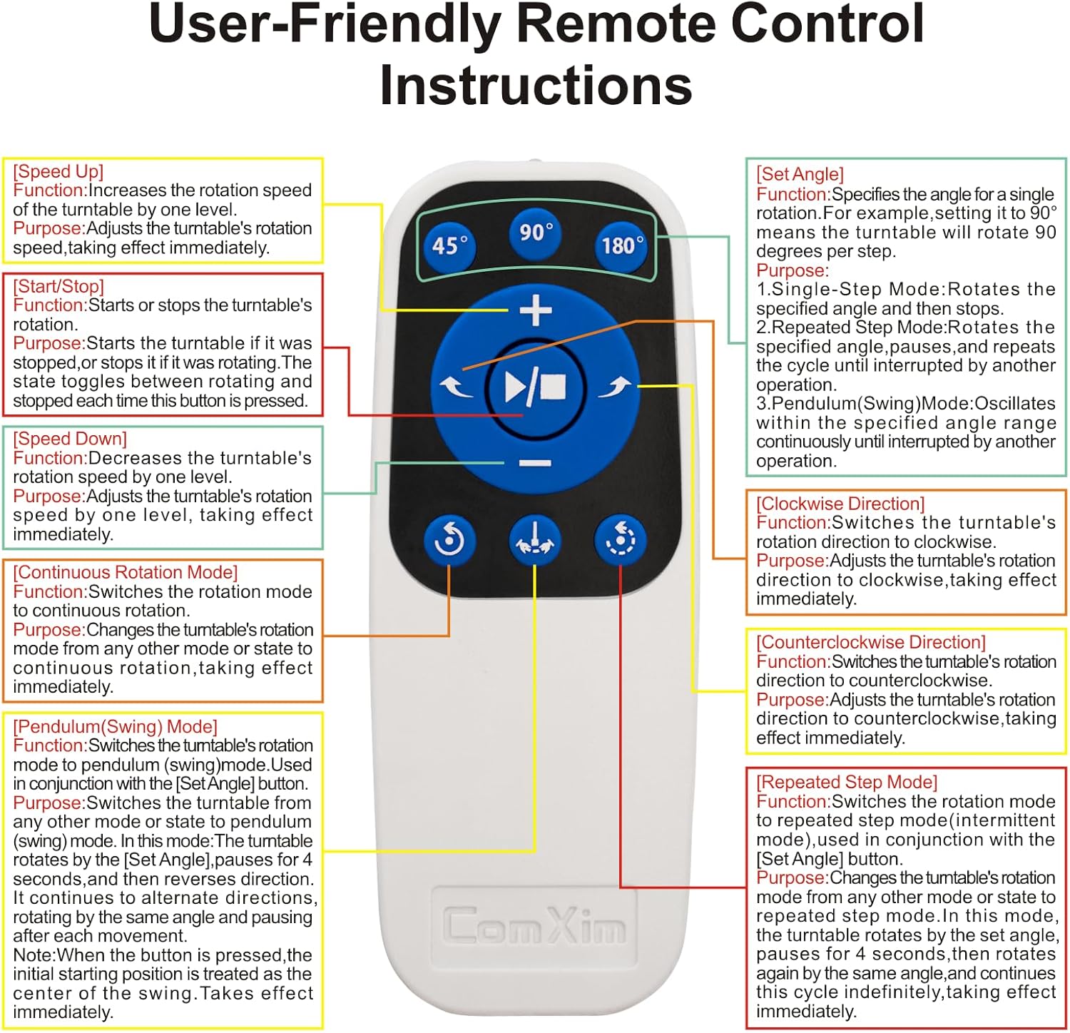 - 【Supports remote control of four rotation modes】: ComXim motorized display stand supports four rotation modes: Continuous rotation; Single-step rotation at 45°, 90°, and 180°; Repeated step rotation at 45°, 90°, and 180°; Pendulum (swing) rotation at 45°, 90°, and 180°. Allows remote control for both clockwise and counterclockwise rotation. Supports remote control for start/pause and speed adjustment (increase/decrease).