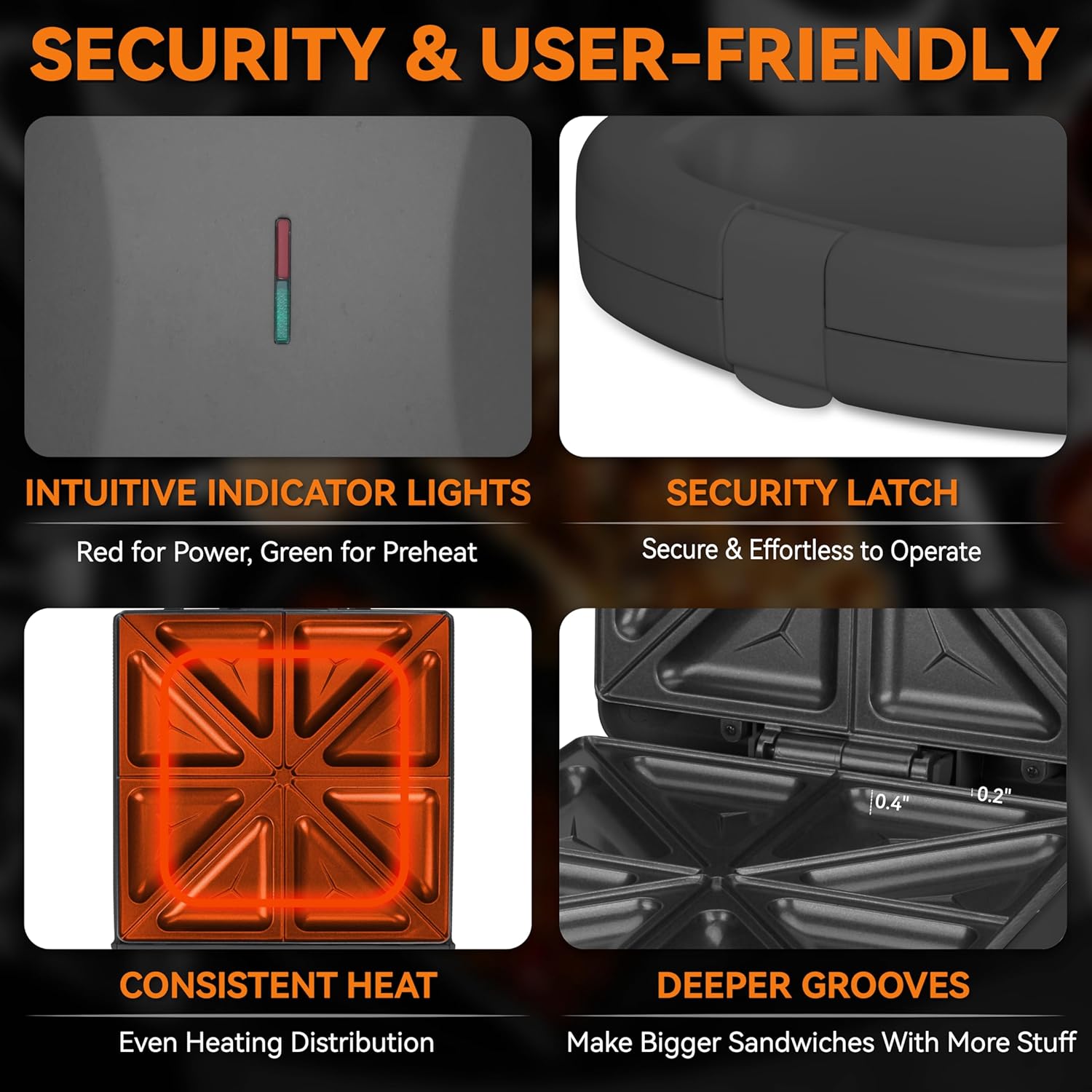 - [Quick Sandwich Maker]: Indulge in 8 hot pocket sandwiches in just 5 minutes or less! Start your day stress-free by crafting 4 slices of nutritious, gourmet-pressed sandwiches with perfect toast. Enjoy consistently delightful sandwiches each time, thanks to the diagonal indentation that toasts and seals the bread for hassle-free slicing. Plus, effortlessly whip up other meals like omelets and French toast.