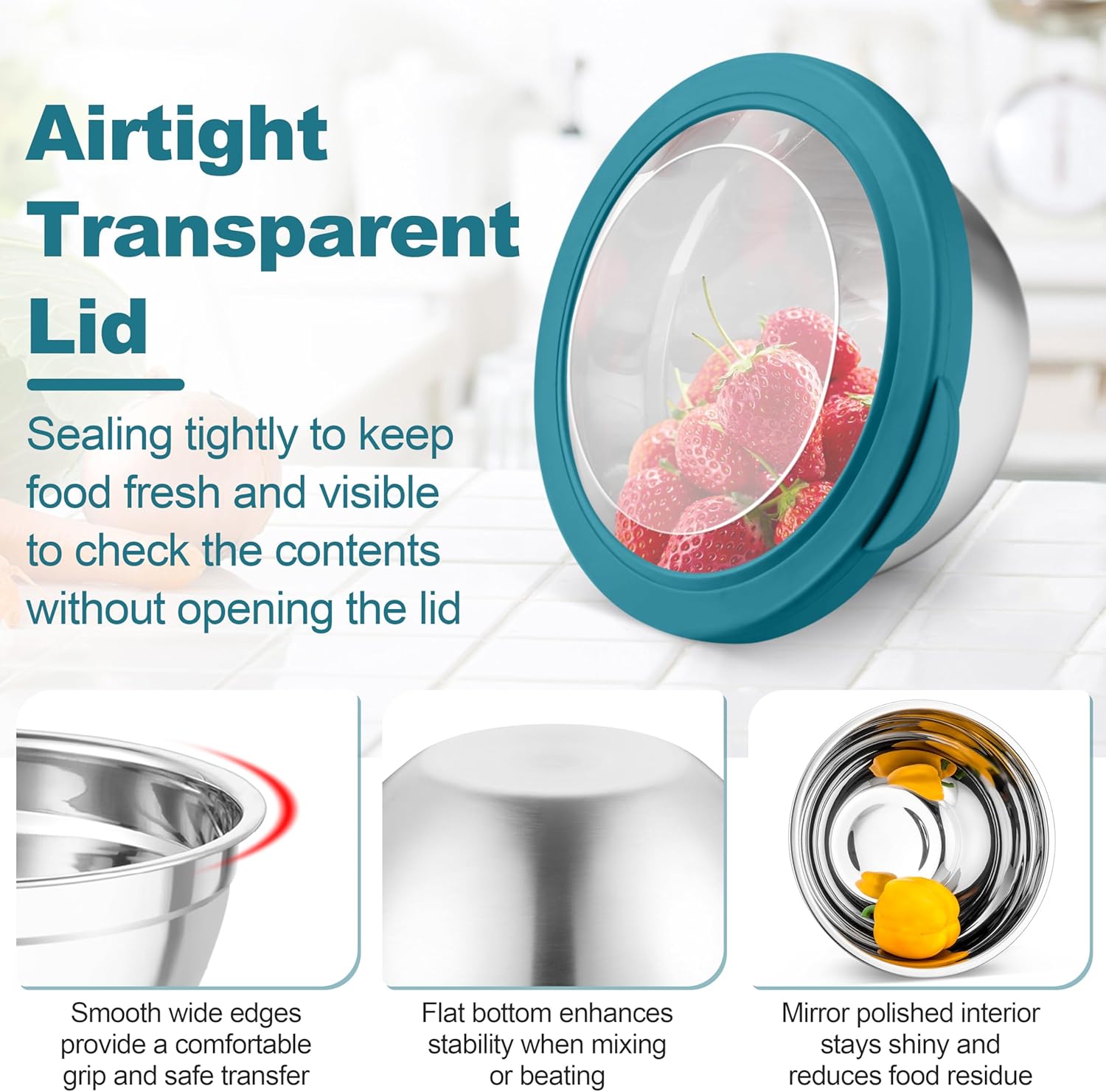 - VISIBLE & CLEAR LIDS: Every mixing bowl equipped with visible airtight lid, Allows you to effortlessly see-through the contents inside the bowl without opening, The silicone side of the lid completely wraps around the bowl for a tight seal, Locks the food freshness and prevents spillage or leakage, Suitable to be used in fridge or freezer, With raised lip on the lid for easy opening