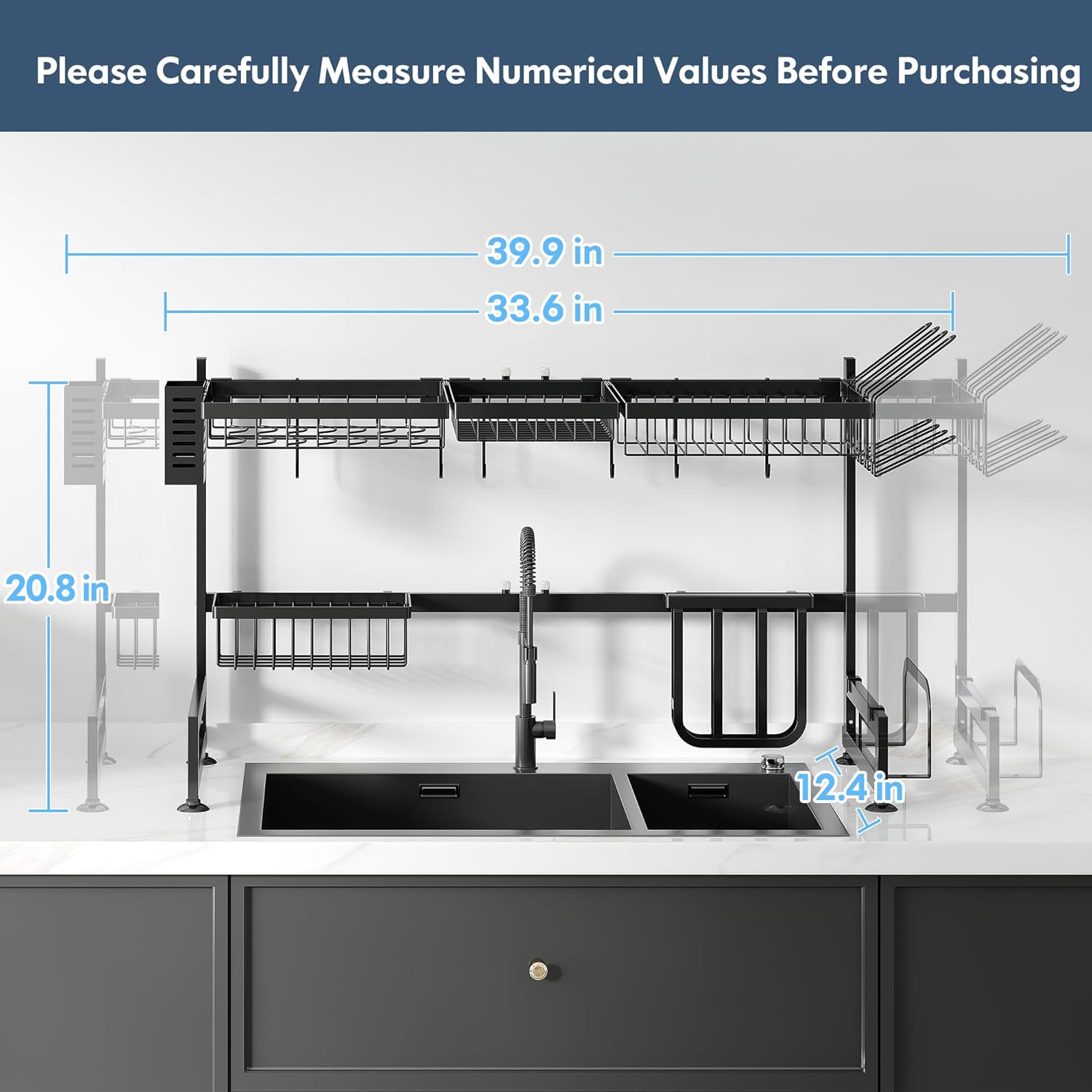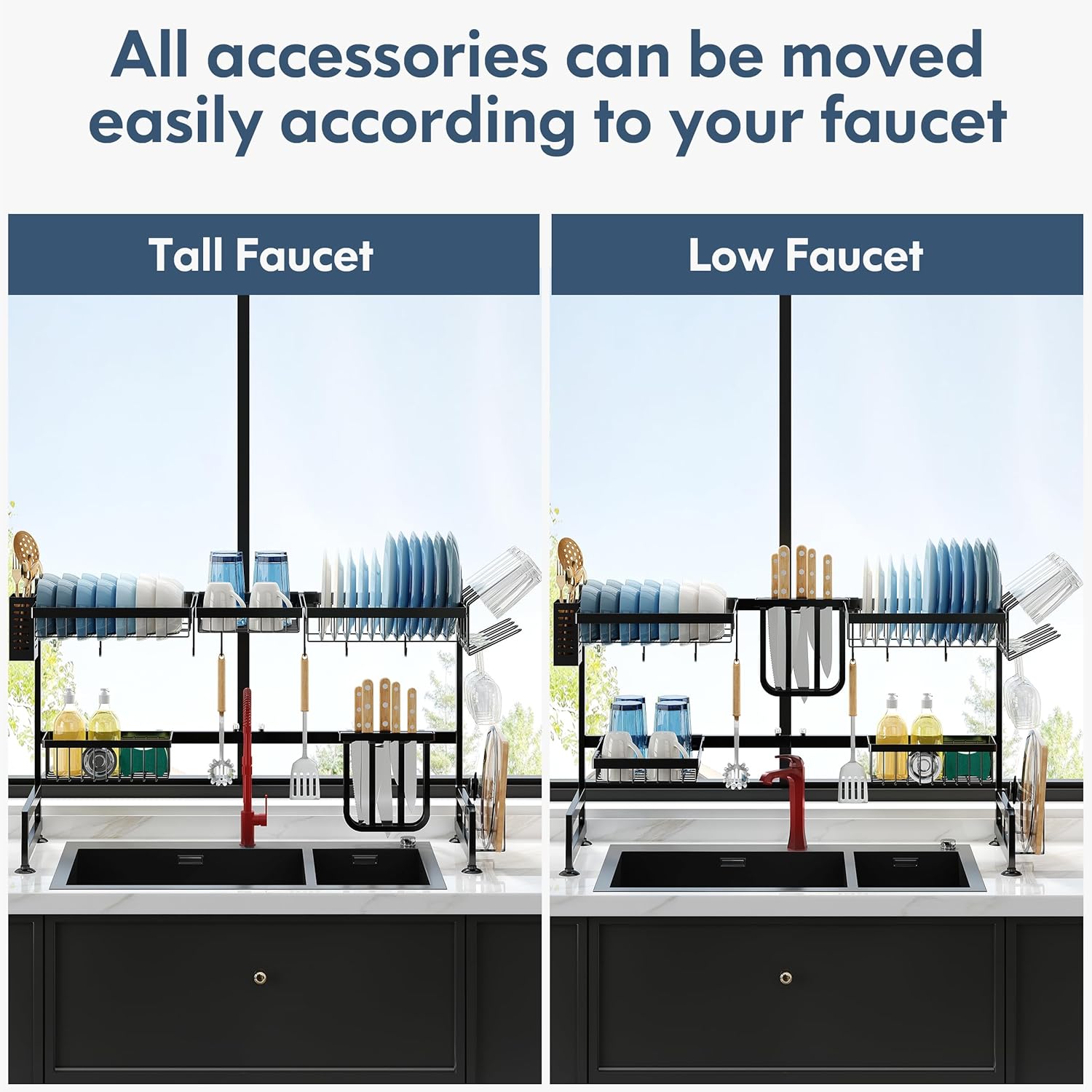 - ๐ Expandable Design for Custom Fit: Adjust the over sink dish drying rack width effortlessly to span most standard single or double sinks, adapting seamlessly to your kitchen layout. The dish drain modular design allows rearranging tiers and accessories to prioritize space for tall glasses, wide pans, or cleaning tools, maximizing vertical storage above the sink