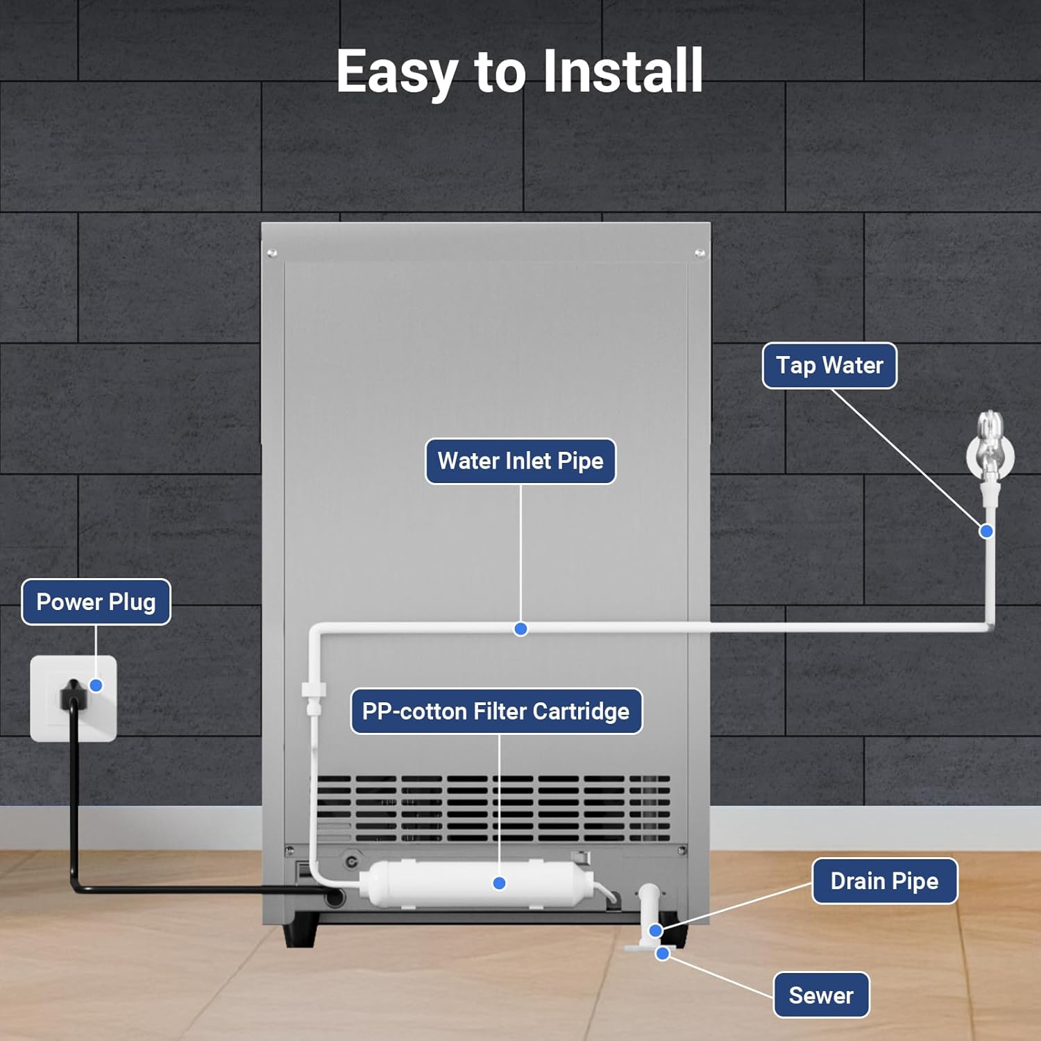 - User-Friendly Design: The freestanding undercounter ice maker is simple to install, featuring four adjustable screw-in feet that allow you to level the unit on uneven surfaces. The water source isn’t limited to tap water, giving you the flexibility to place the machine wherever it’s needed. Whether freestanding or built-in, it’s perfect for a variety of settings, from bustling restaurants and offices to casual family events.