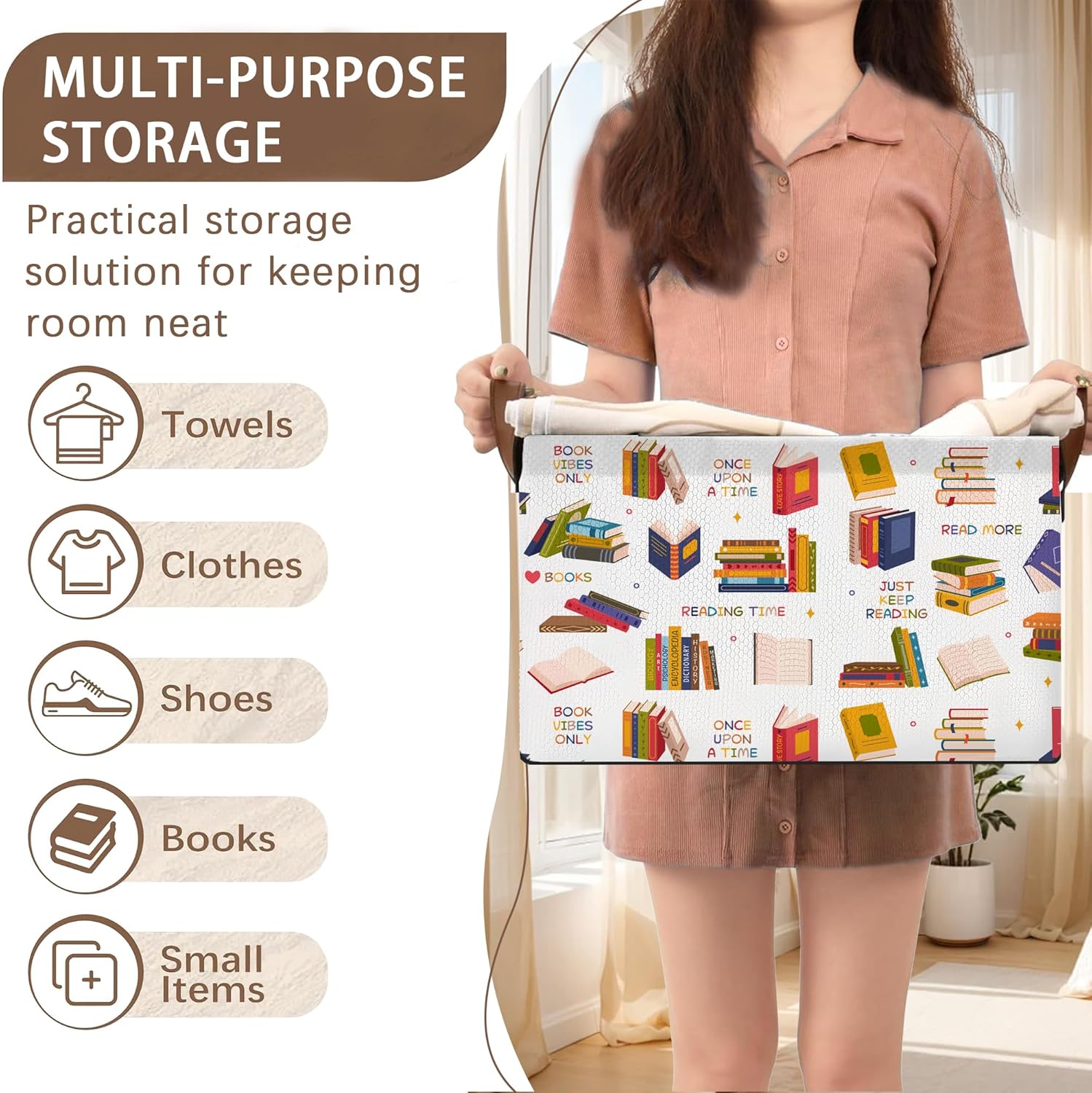 Book Lover Storage Basket Large 17x11.5x10.5 Inche-Collapsible Fabric Organizer Bin with Handles for Library, Reading Nook, Office-Foldable Decorative Hamper with Classic Book Spine Design-Single Pack