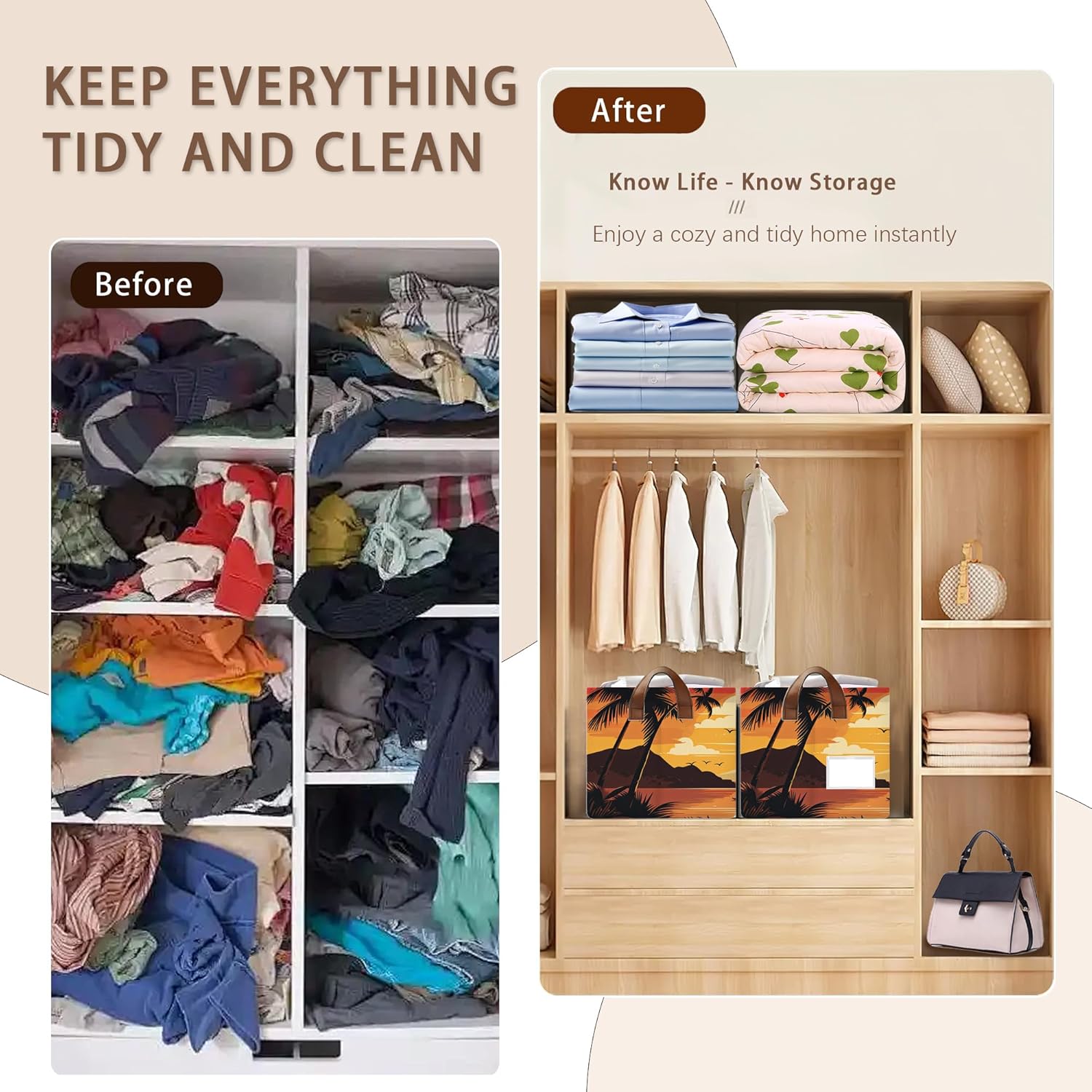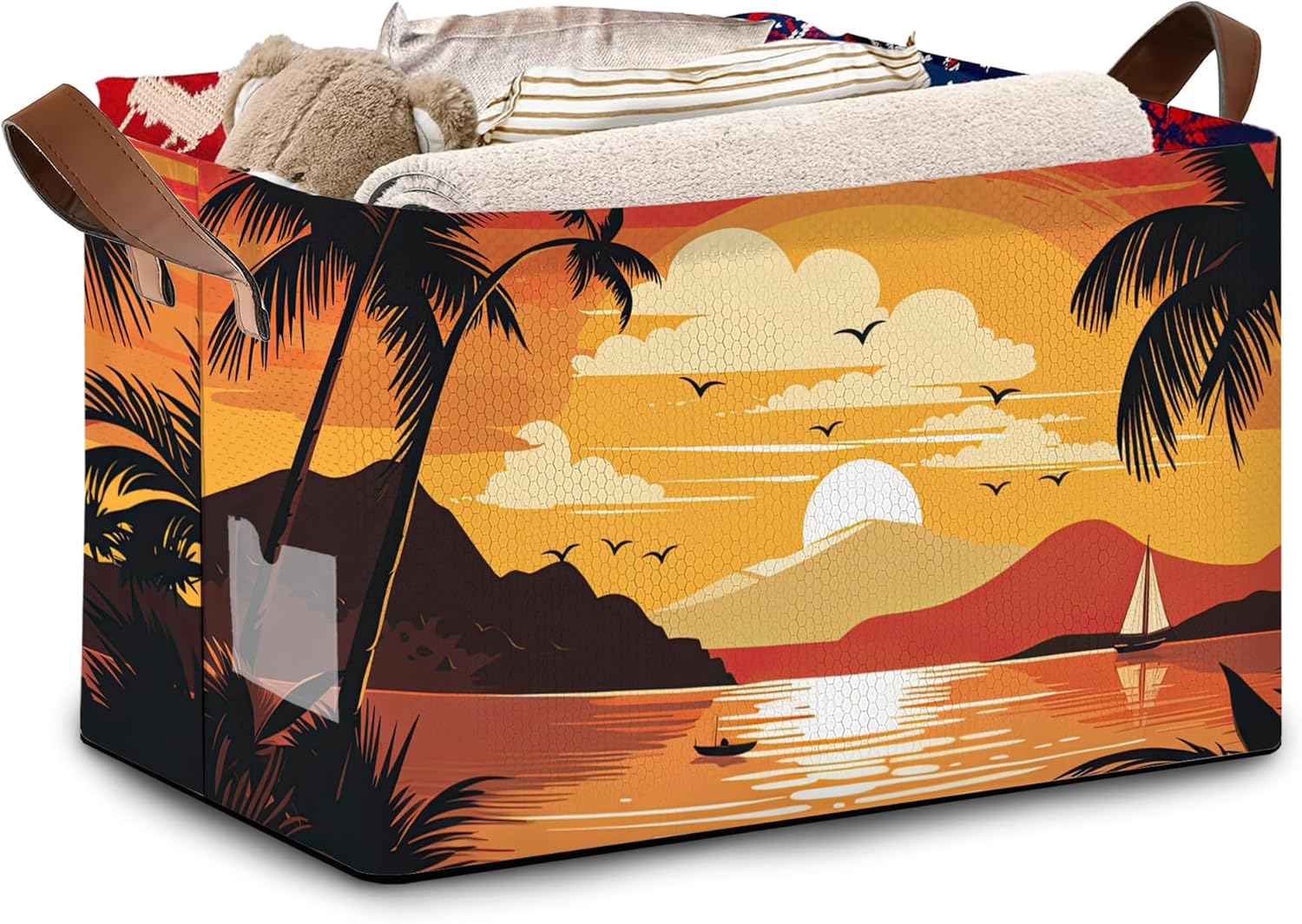 Foldable Collapsible Storage Bin with Summer Sunset Design-17x11.5x10.5 Inch Organizer Basket for Beach Decor, Home Storage-Single Pack, No Lid Space-Saving Box