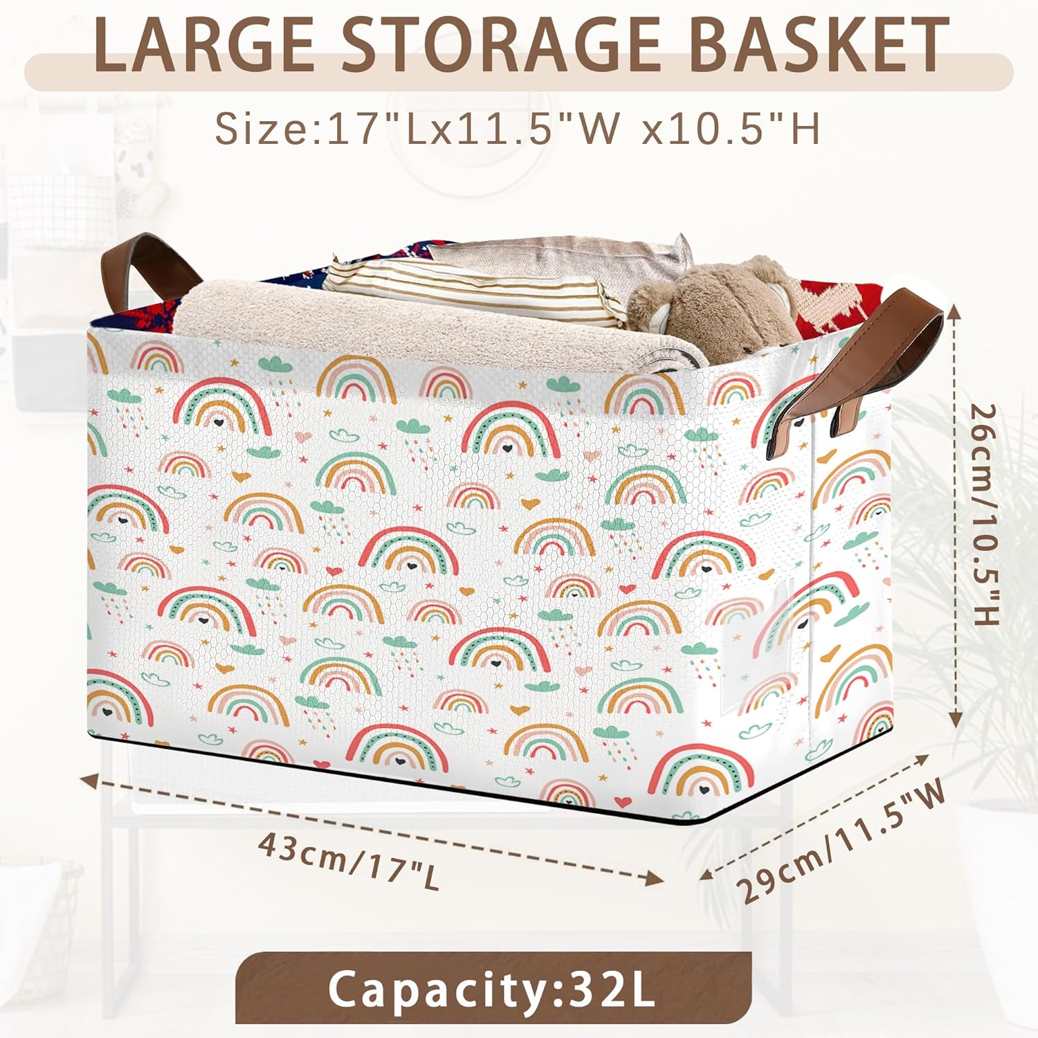 Rainbow Colors Storage Basket Large 17x11.5x10.5 Inche-Collapsible Fabric Organizer Bin with Handles for Kids Room, Nursery, Playroom-Foldable Decorative Hamper with Multicolor Arc Design-Single Pack