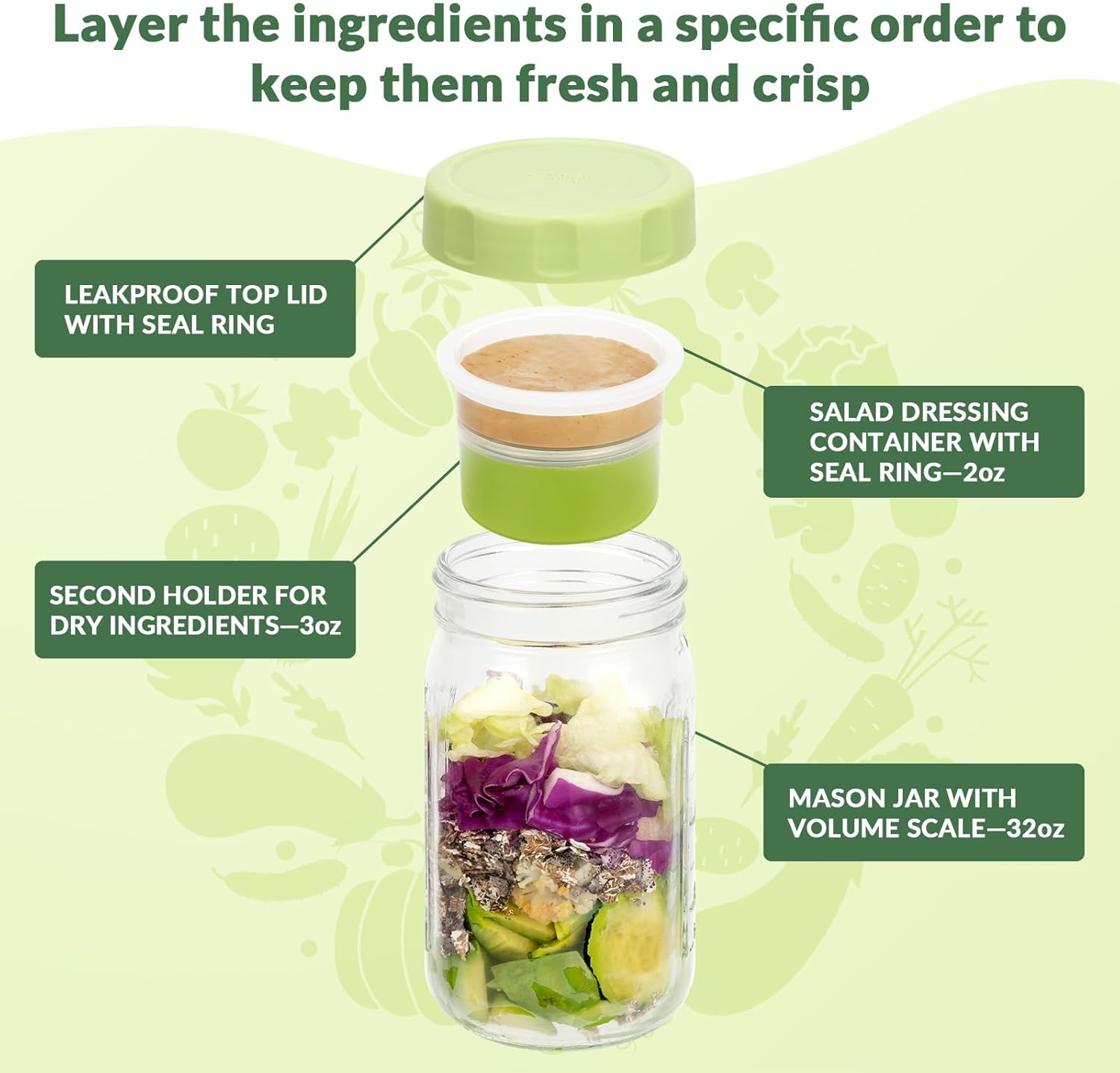 - Kitchen Saver MASON JARS - Using Wide-Mouth Mason Jars as salad prep containers makes for a more durable, eco-friendly and minimalist style, and we've added removable silicone leak-proof rings to both the top quality plastic lid and the separated salad dressing container, so feel free to shake it without fear of leakage! (TIPS: The jars are NON-heat resistant glass, hot liquid is not available. NOT microwave safe.)