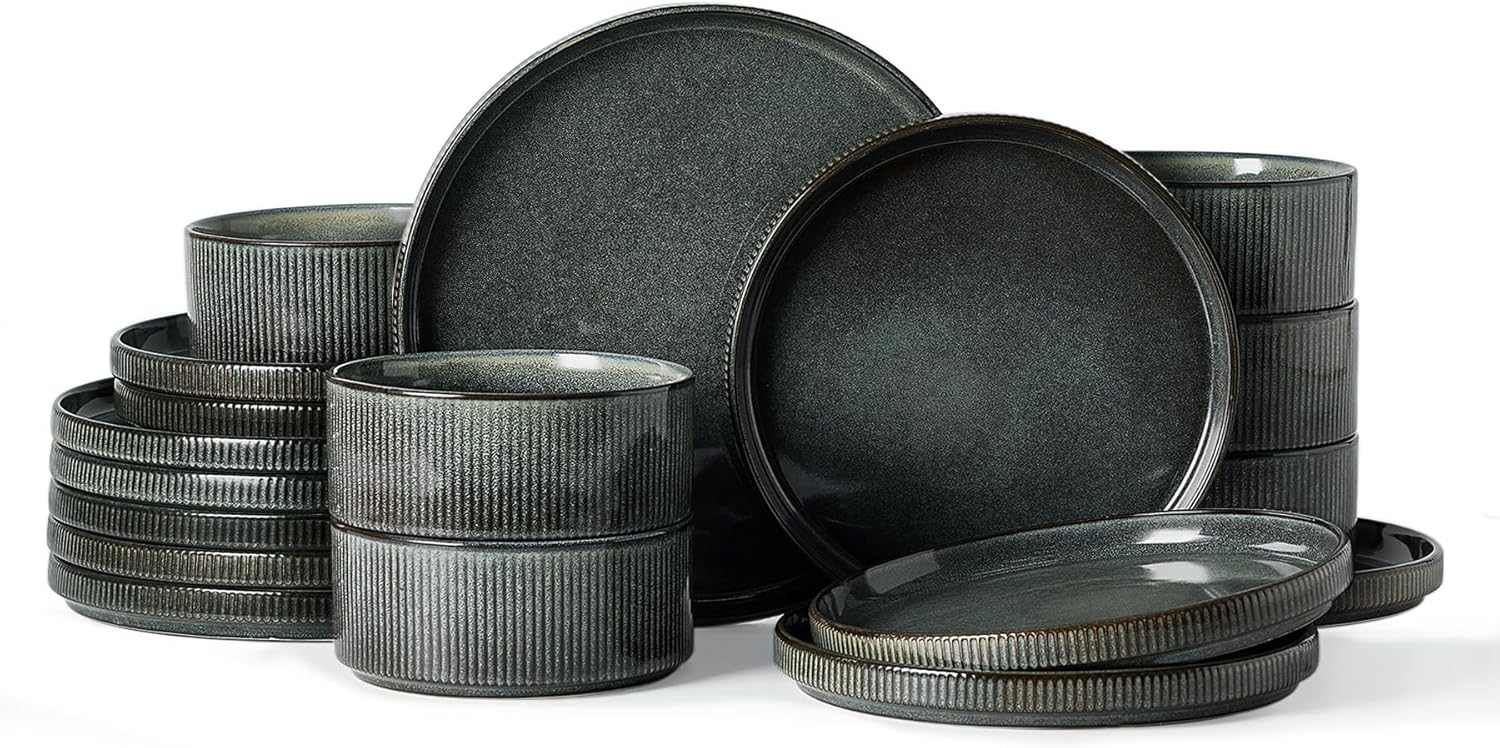 Famiware Star Dinnerware Set, Plates and Bowls Sets for 6 (18pcs), Ribbed Stoneware Dishes - Chip & Scratch Resistant, Microwave & Dishwasher Safe Kitchenware, Deep Forest