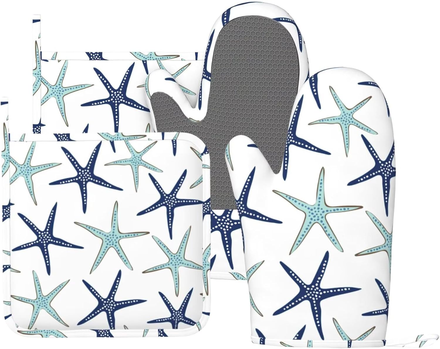 Sea Stars Oven Mitts and Pot Holders Set of 4 Silicone Navy Blue Turquoise Coastal Sea Stars Kitchen Mitten Gloves and Non-Slip Potholders Set Heat Resistant Oven Gloves Hot Holders for BBQ