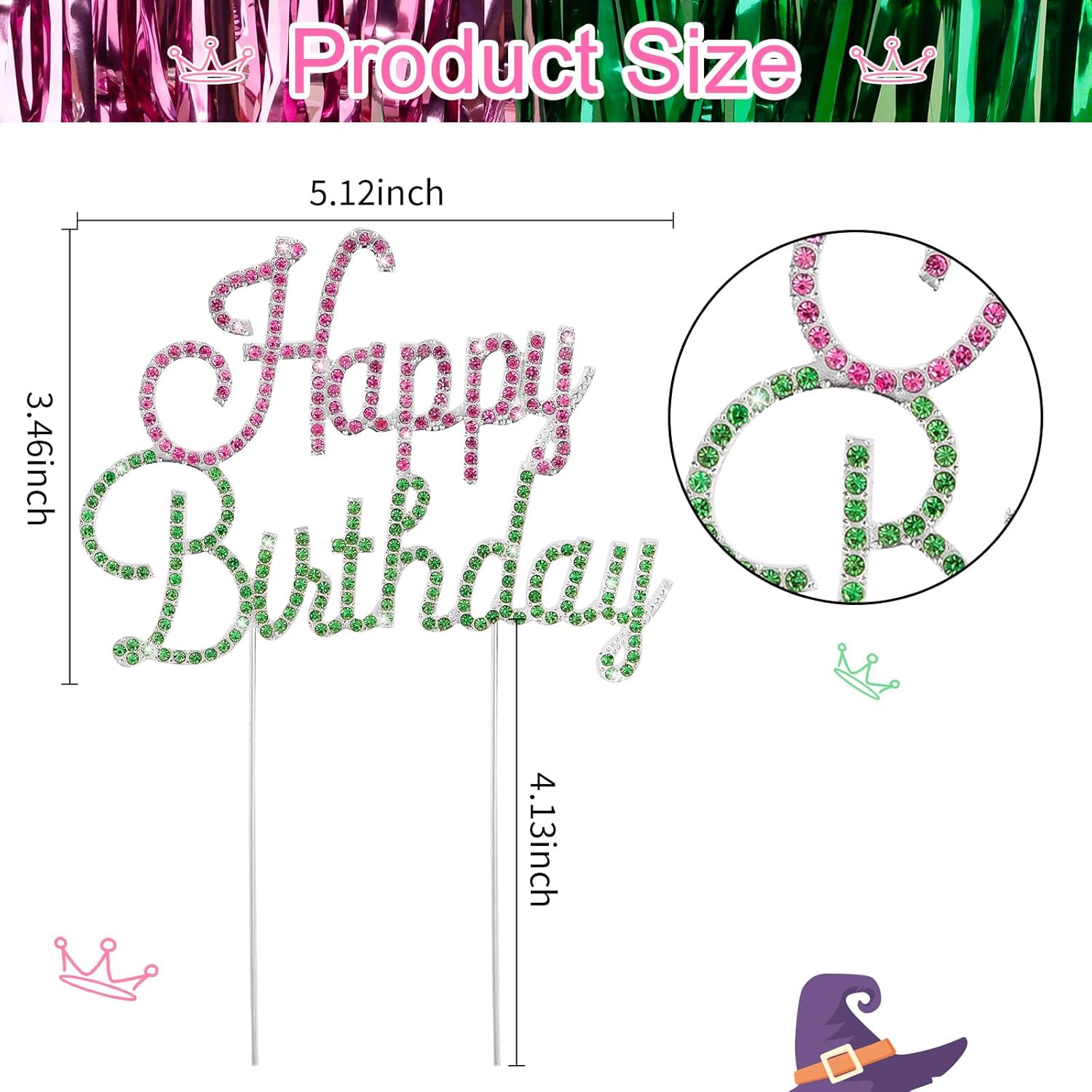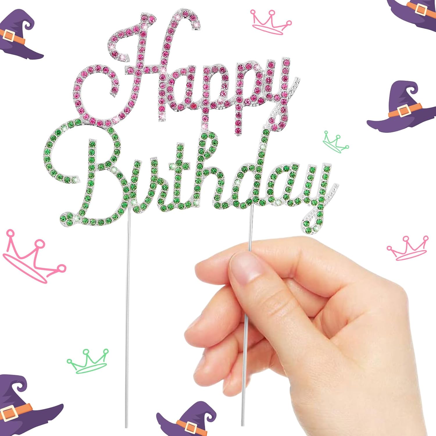 - Make Your Cake the Life of the Party: This wicked cool birthday cake topper is the ultimate way to jazz up any celebration! The "Happy Birthday" sign is decked out in blingin’ pink and green rhinestones, set in a sleek silver frame, and comes with sturdy metal prongs to stick securely into your cake