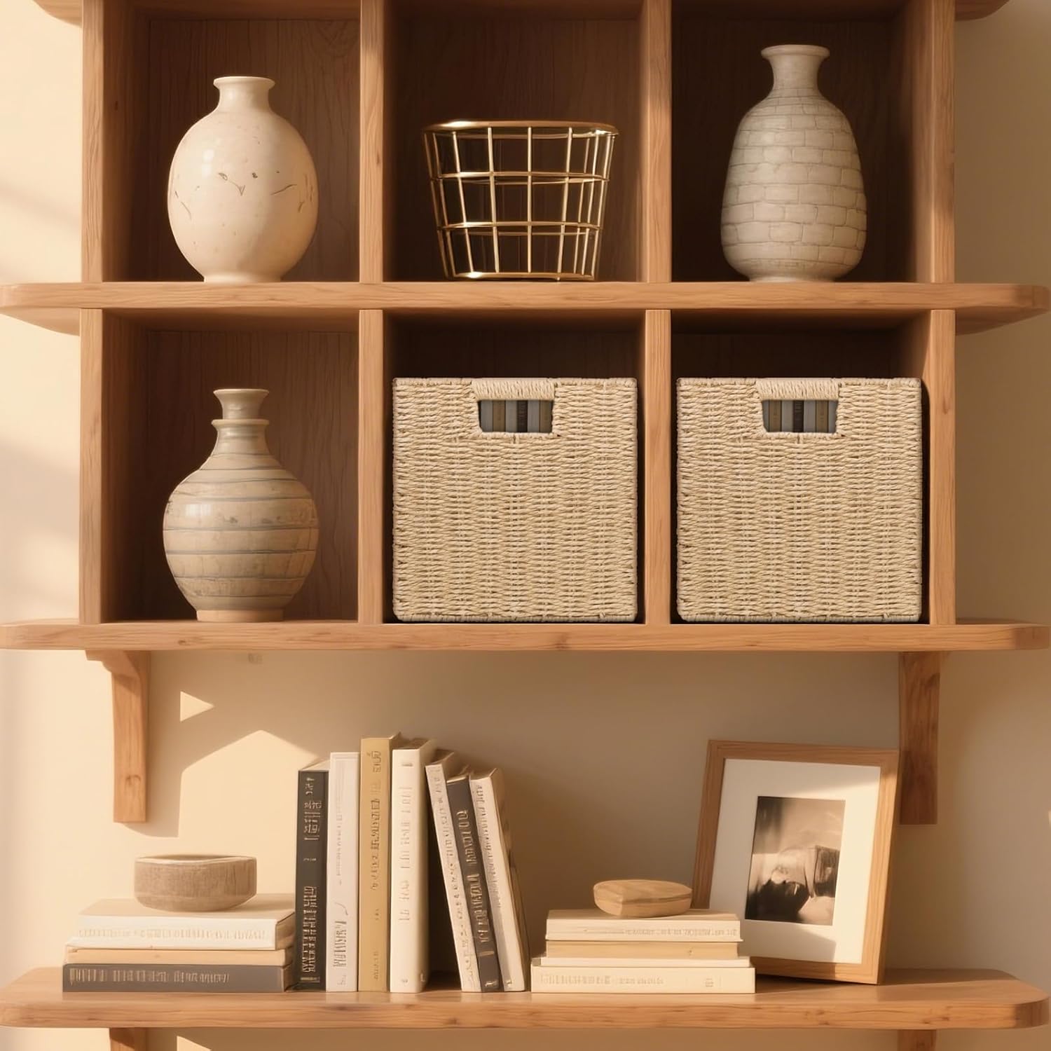 Wicker Storage Baskets for Organizing, 3 Pack Rustic Foldable Square Basket for Shelves, Handwoven Cubby Organizer Bins for Home Decor, Small Cube Storage Bin for Closet Organization (Natural 11 inch)