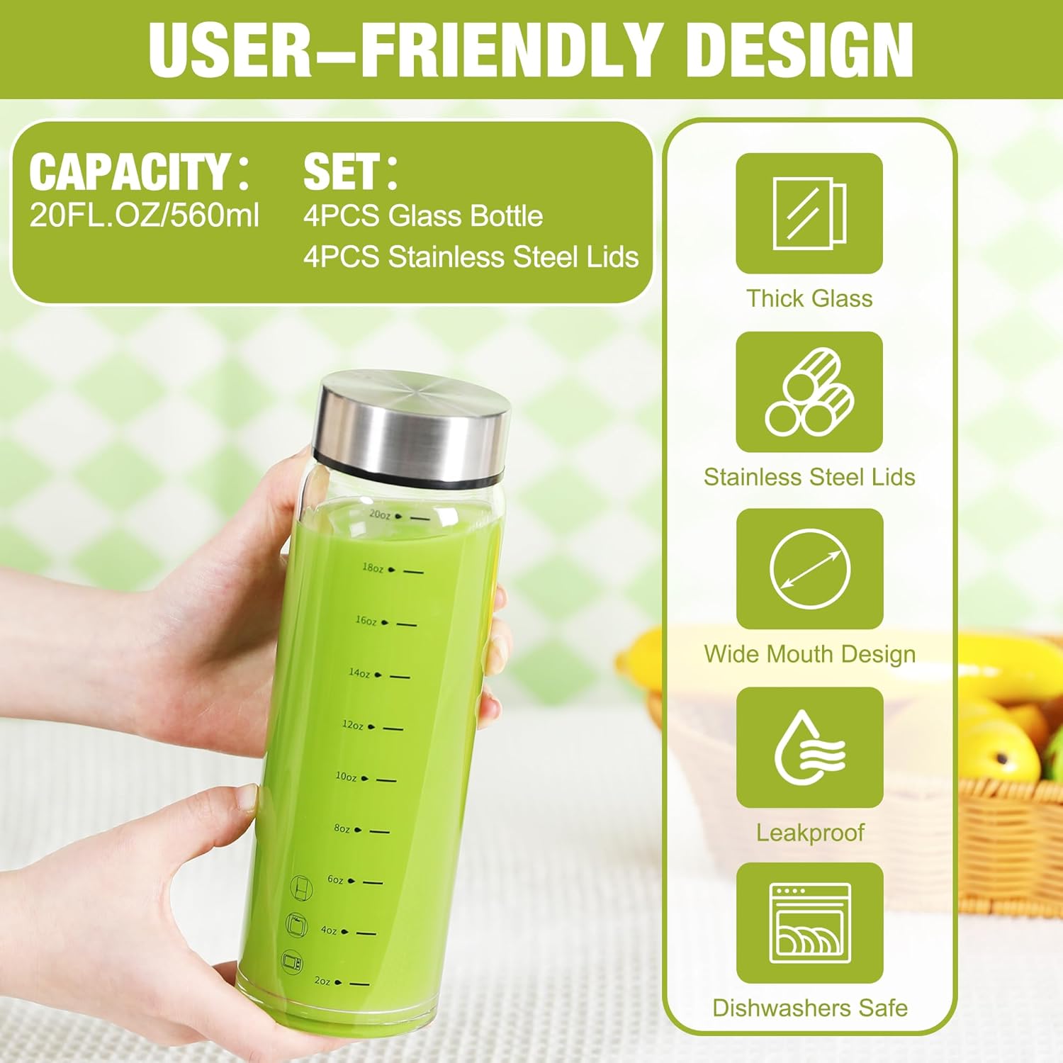 20oz Glass Juice Bottles – 4 Pack Reusable Wide Mouth Bottles with Stainless Steel Lids & Cleaning Brush, BPA-Free Water Bottles for Juicing, Smoothies, Milk, and Protein (600ml)