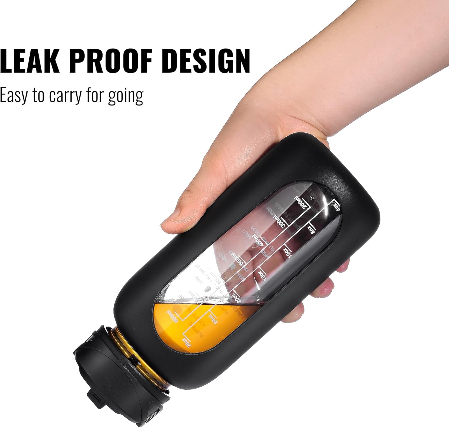 - GLASS WATER BOTTLE WITH SILICONE SLEEVE: The big water bottle for easy carry and use. The color of the silicone sleeve varies and stylish, provides impact protection, easy grip, no slips and reduced condensation. Enjoy the happy hour of drinking water