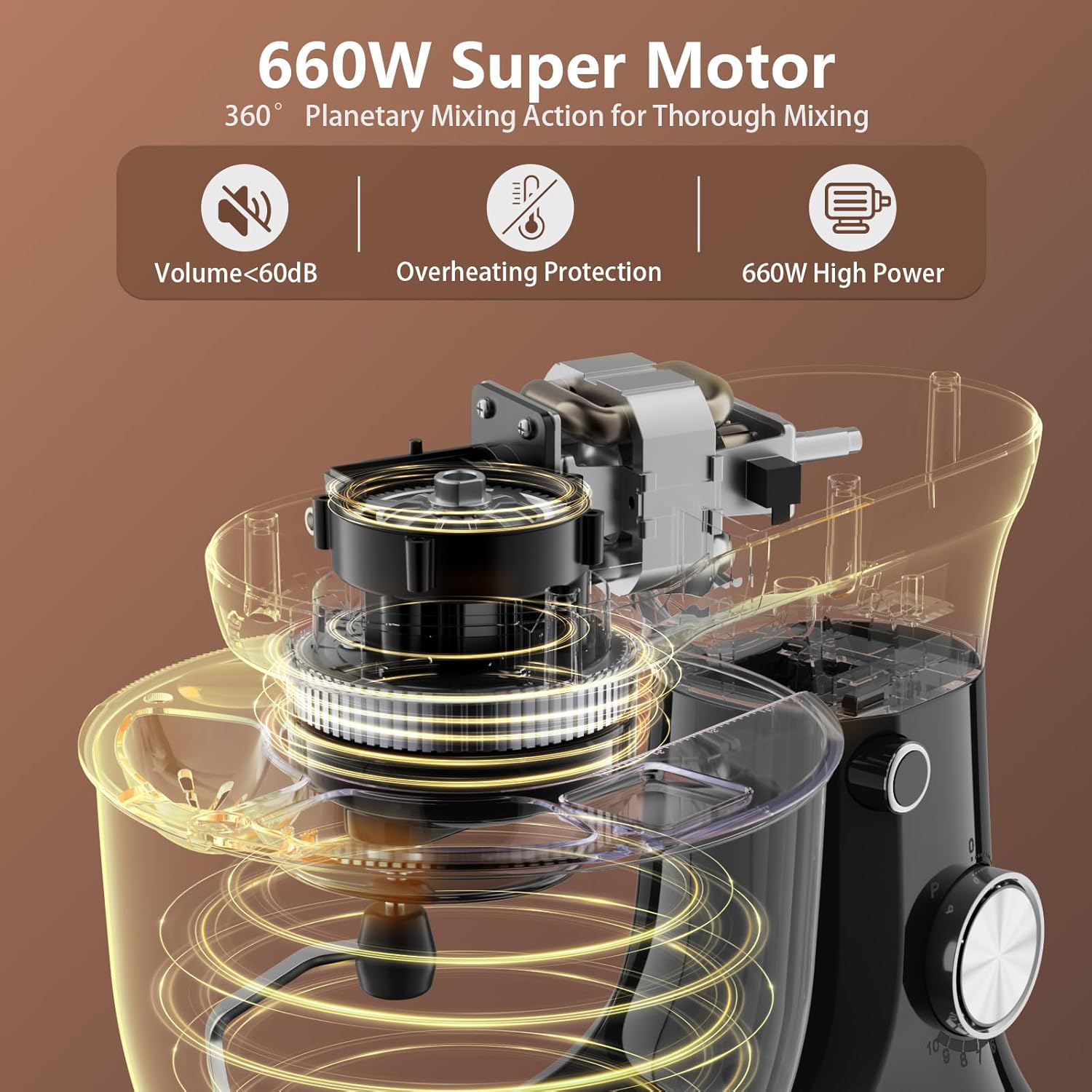 - 660W POWERFUL DYNAMICS - Powered by a precision-engineered 660W motor with copper-core technology, this mixer delivers high-torque performance . Its smart energy algorithm reduces power consumption by 35% compared to conventional models. The dual-cooling system ensures continuous 1-hour operation without overheating.