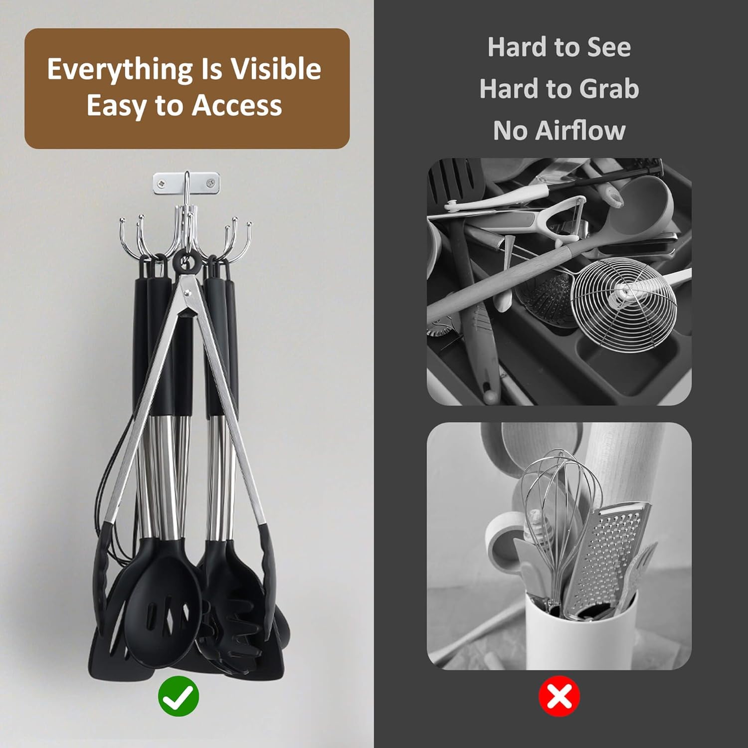 - Free Up Counter & Drawer Space: Instead of cluttering your countertops and drawers with utensils, this wall-mounted holder maximizes vertical space. Keep your utensils in clear view and well-organized while creating a tidier and more efficient kitchen setup.