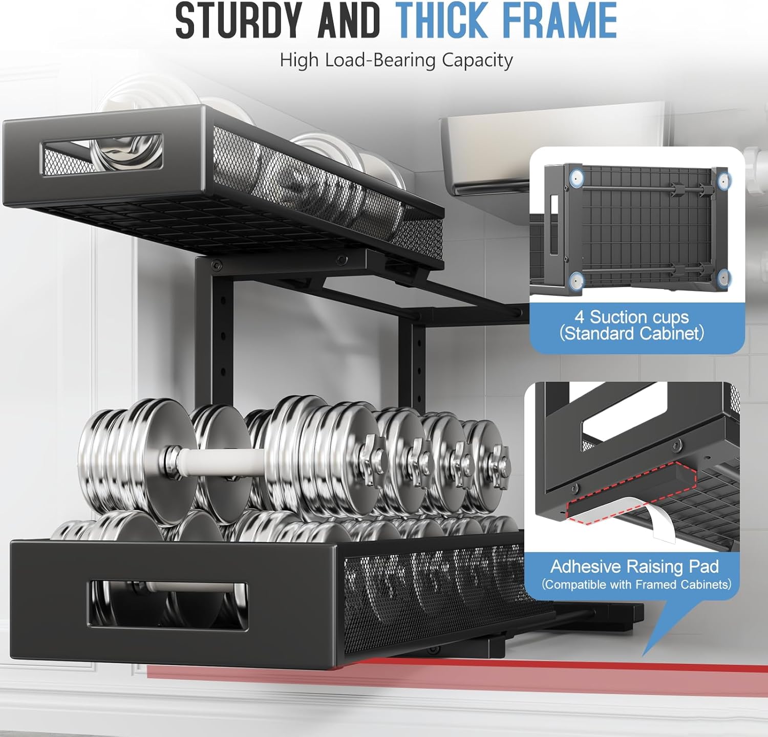 - 【2-Tier Pull-Out Design for Easy Access】This under-sink organizer features a double-layer pull-out design, allowing you to easily access items at the deepest part. The upgraded, thickened iron circular sliding rails ensure a smooth and seamless pulling experience, making each use effortless. The unique pull-out locking mechanism effectively prevents the drawers from being completely pulled out, avoiding the risk of items falling or structural damage caused by over-pulling, ensuring safer and more convenient use.
