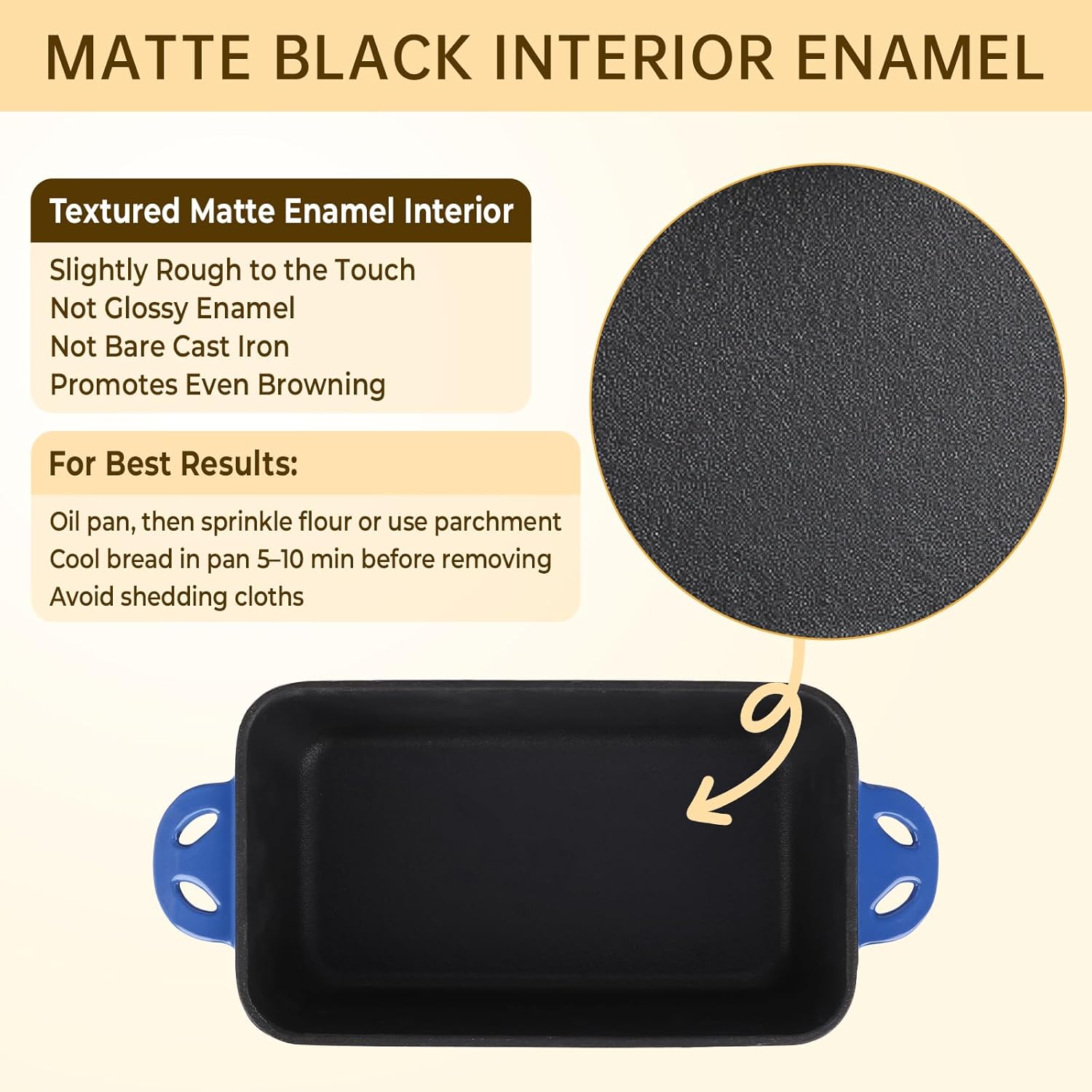 - Matte Black Interior Enamel: Slightly textured and non-glossy to enhance browning; resists scratches, stains and chips — great for baking homemade bread