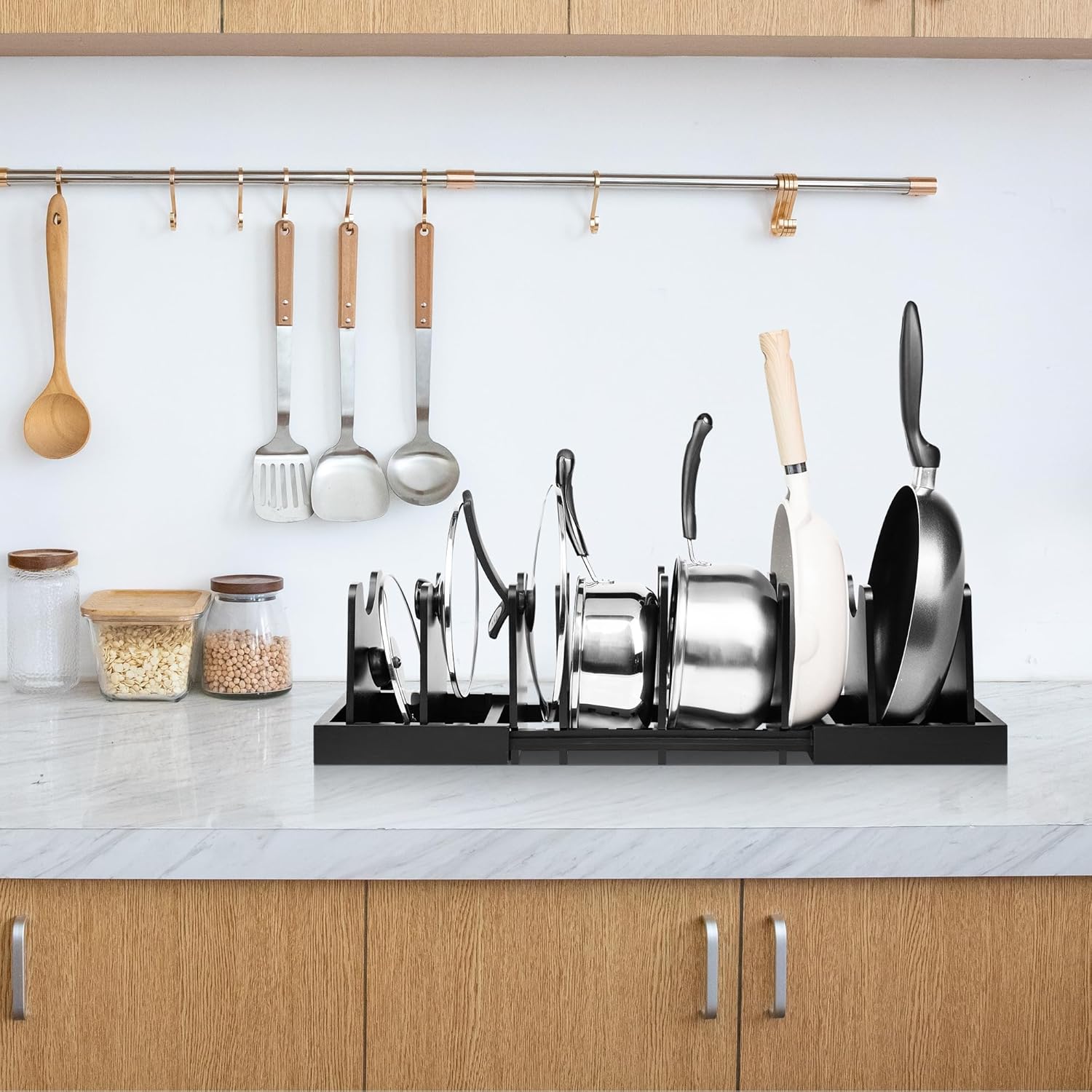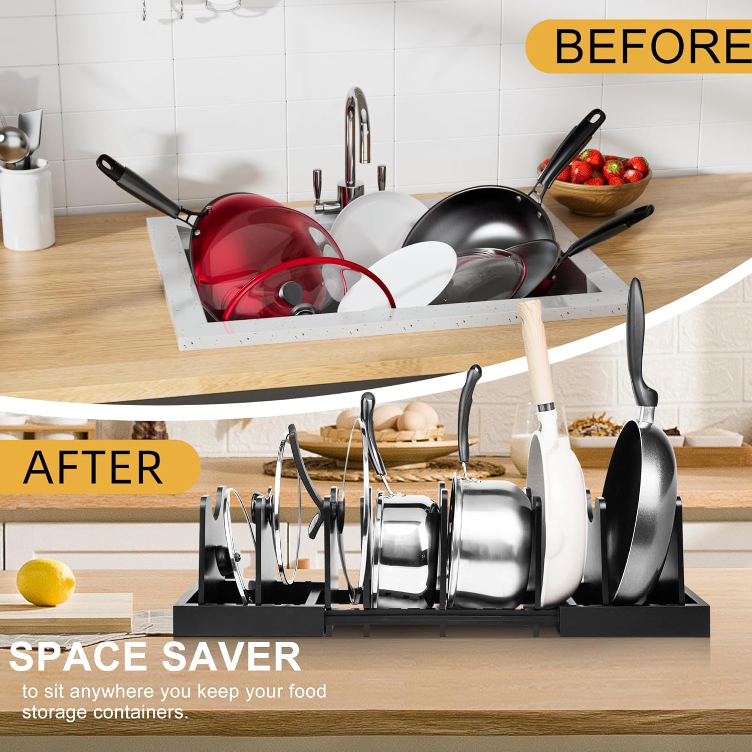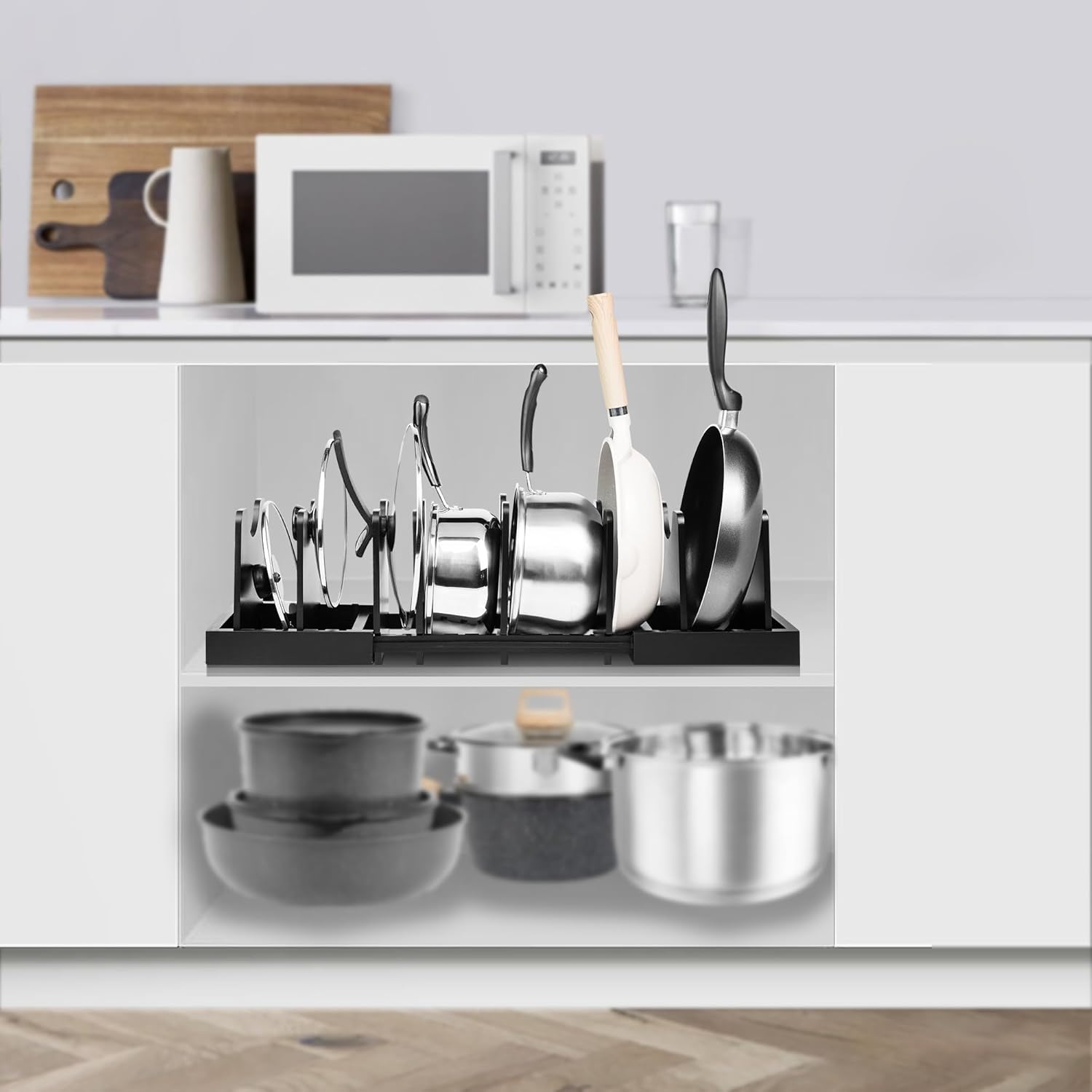 - Widely Used and Stored: Use our pot racks to organize your pots, pans, cast iron, lids, trays and bakeware, it will help you save more cabinet and countertop space in the kitchen,very perfect pan organizer rack for cabinet
