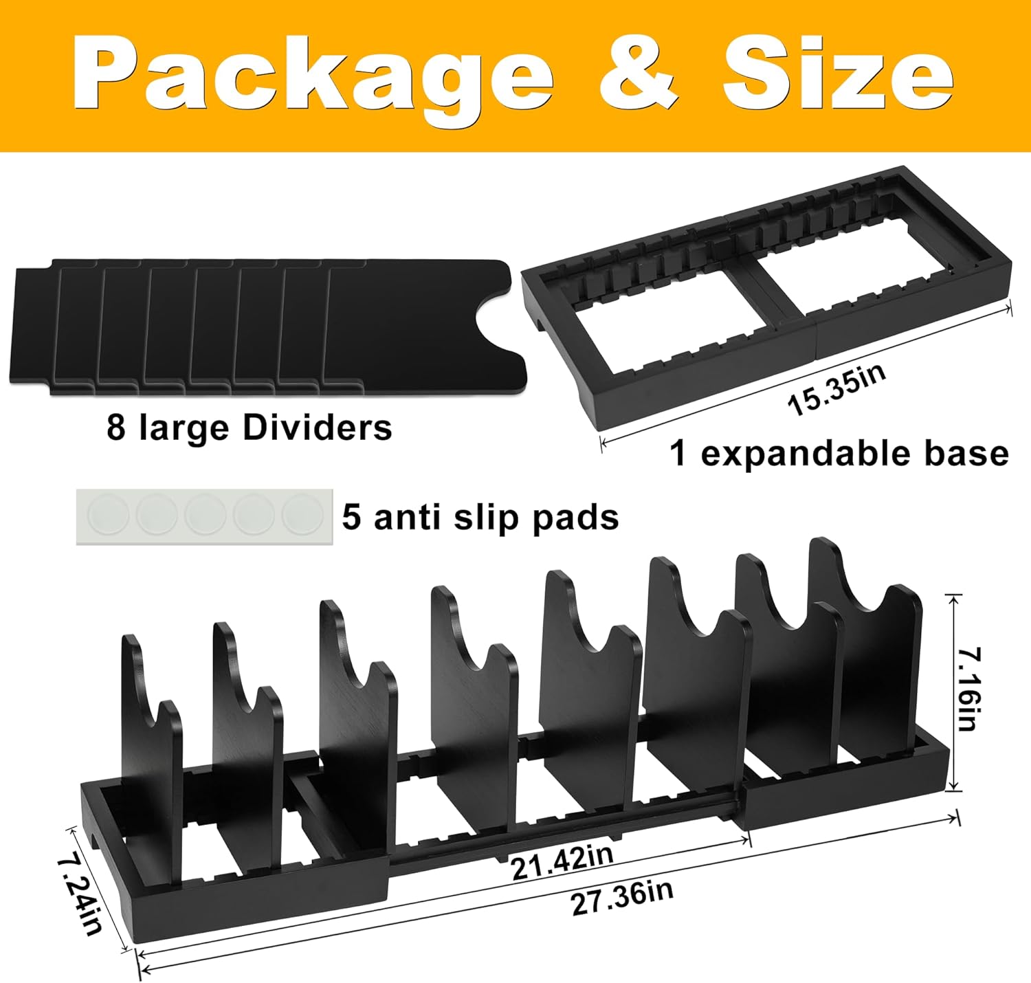 - Easy to Install:No extra tools required. Simply insert the divider into the slot. It also comes with non-slip silicone pads to protect your surfaces and prevent slipping. Equipped with 8 dividers and 25 slots, this is adjustable and expandable to fit various sizes of drawers and cabinet spaces. The non-slip mat is very stable, so you can put it on the cabinet or some other high places with more confidence, so that you can use it more at ease