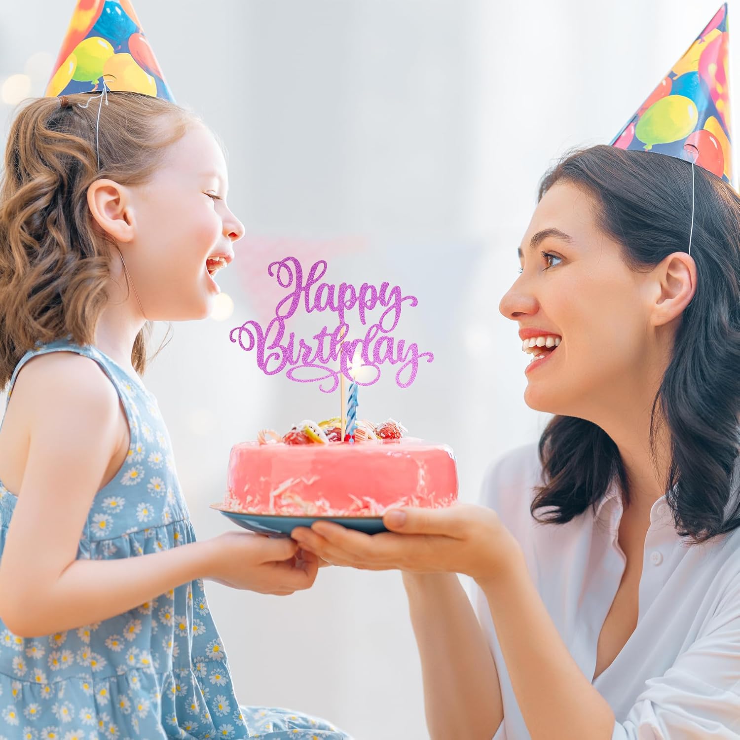 Happy Birthday Cake Toppers 9 Inch Glitter Happy Birthday Cake Pick for Birthday Anniversary Theme Party Cake Decorations Supplies - Rose Red