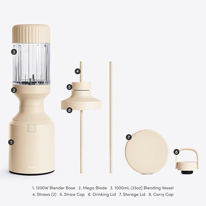 - WHAT'S INCLUDED: 1200W Motor Blender Base, Beast Mega Blade, 1000mL Blending Vessels, Storage Lid, Drinking Lid, Carry Cap, Straw Cap, 2x Straws. Designed for 120V use only.