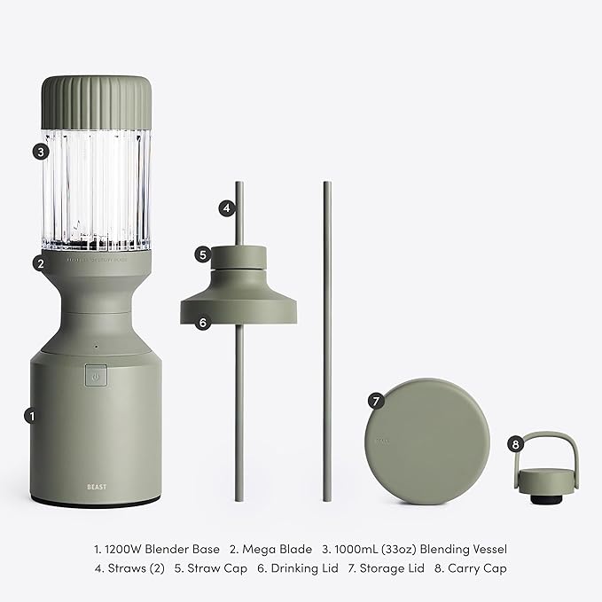 Beast Mega 1200 | Premium Countertop Blender | Smoothies, Shakes, Sauces, Dips, Soups | Blends Ice and Frozen Fruit | Includes Extra Lids and Straw System | 1200W | (Sage, 120V)
