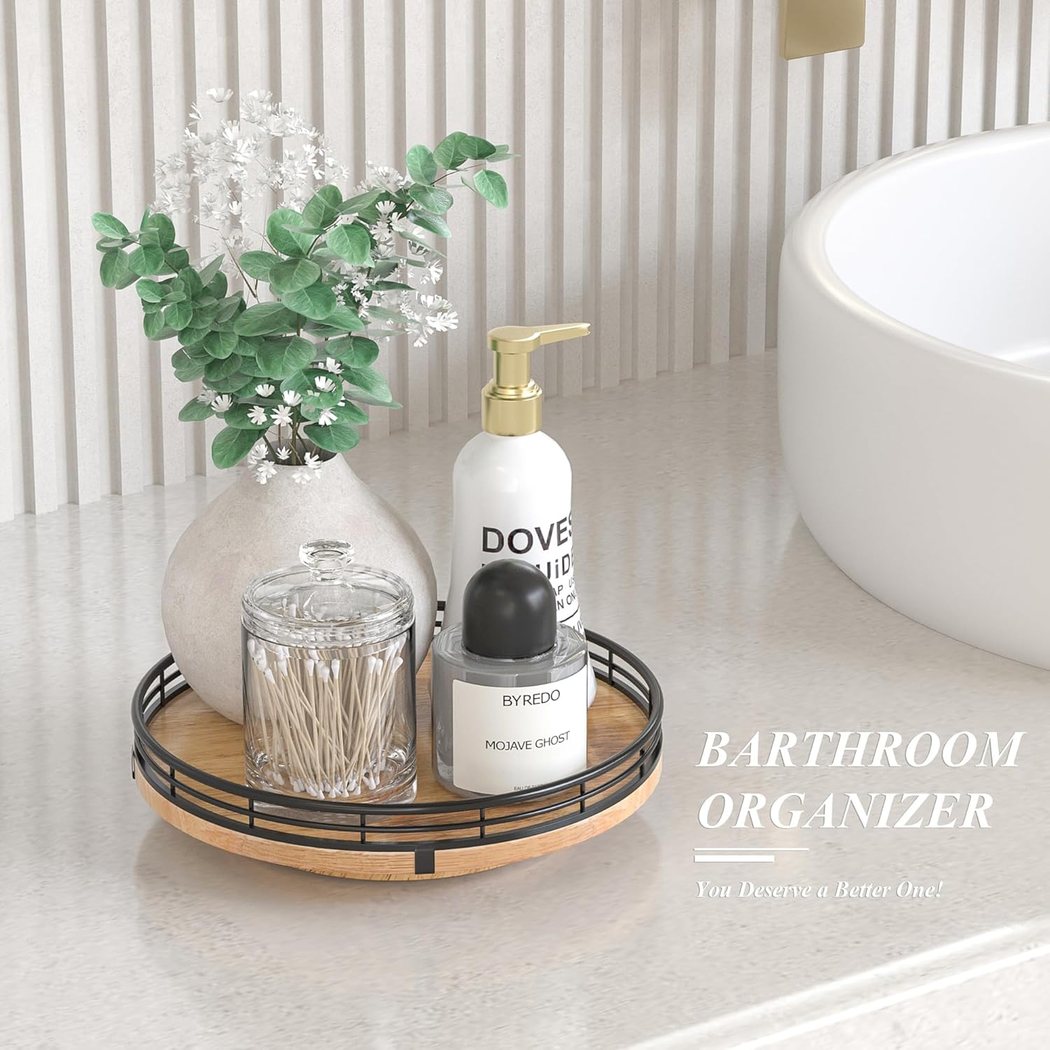 - UPDATED DESIGN: With larger wood base on this lazy Susan for table top, the turntable organizer doesn't wobble, even with heavier items on it. With premium oak wood and classical iron fence make this lazy Susan turntable stylish, functional and adding a touch of rustic charm. it’s also very easy to clean. There are included anti-slip pads on the bottom of the lazy Susan for extra surface protection.