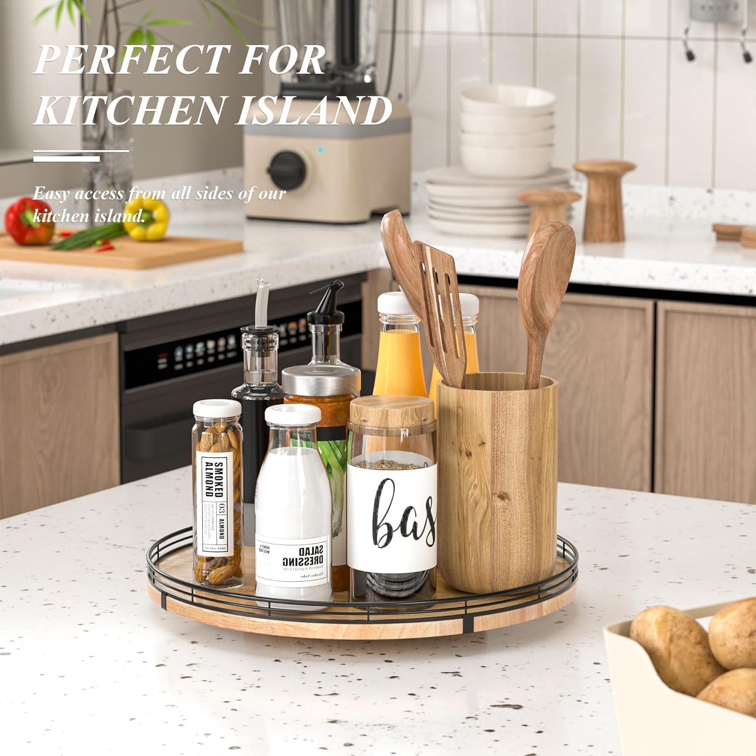 - PREMIUM MATERIAL: Our farmhouse lazy Susan organizer is made of natural solid oak wood and strong metal, sturdy, durable and premium quality. This wooden turntable organizer is a game-changer for keeping your kitchen organized. The farmhouse oak finish gives it a rustic, charming look that will fit perfectly with your kitchen decor.