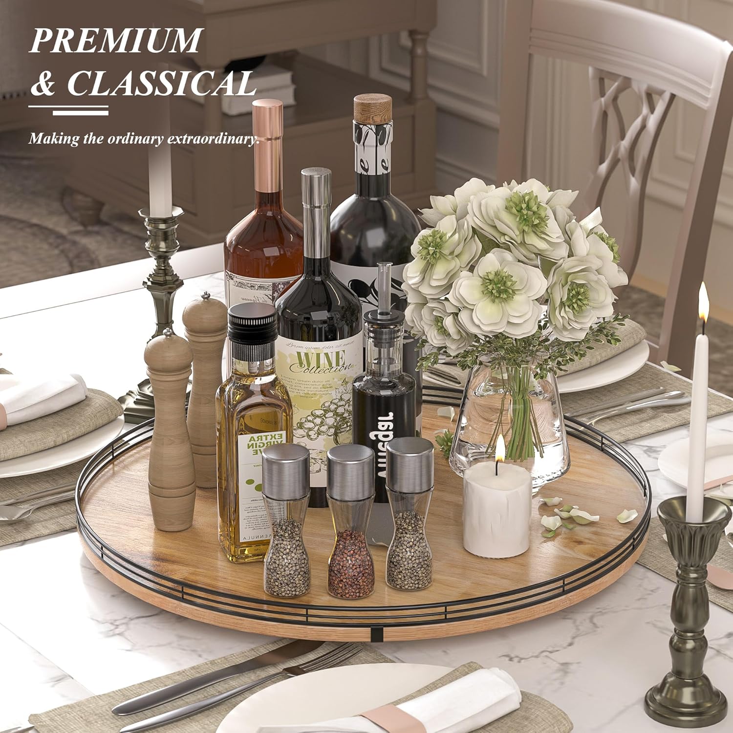 - UPDATED DESIGN: With larger wood base on this lazy Susan for table top, the turntable organizer doesn't wobble, even with heavier items on it. With premium oak wood and classical iron fence make this lazy Susan turntable stylish, functional and adding a touch of rustic charm. itβs also very easy to clean. There are included anti-slip pads on the bottom of the lazy Susan for extra surface protection.