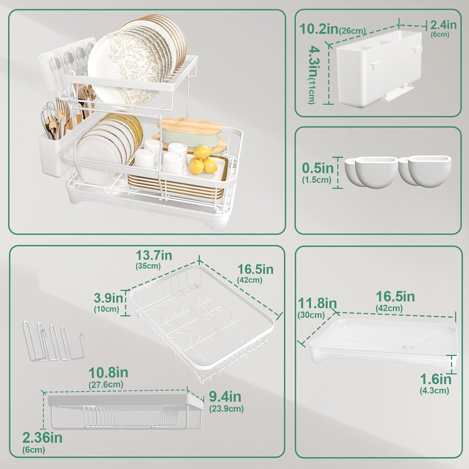 Dish Drying Rack, Two-Tier Dish Drying Rack with Utensil Holder and Cutlery Tray – Auto-Draining Large Capacity Dish Drainer with Drainboard for Kitchen Counter, White