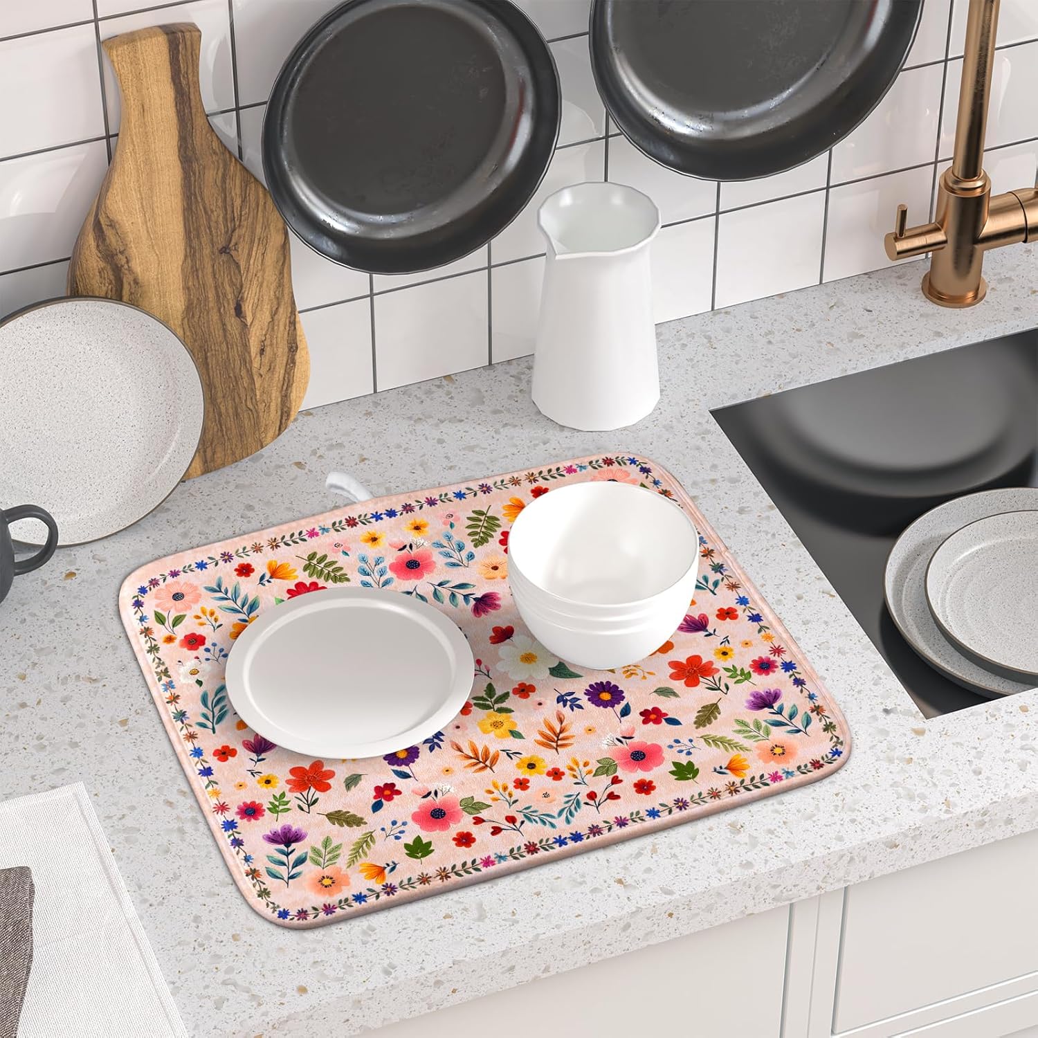 - Size: The boho floral drying mat measure 16 x 18 in(40.6 x 45.7 cm) for you. Fit most countertop space. Different design on 2 sides, one side can suck moisture with flower pattern, another one gray non-slip side