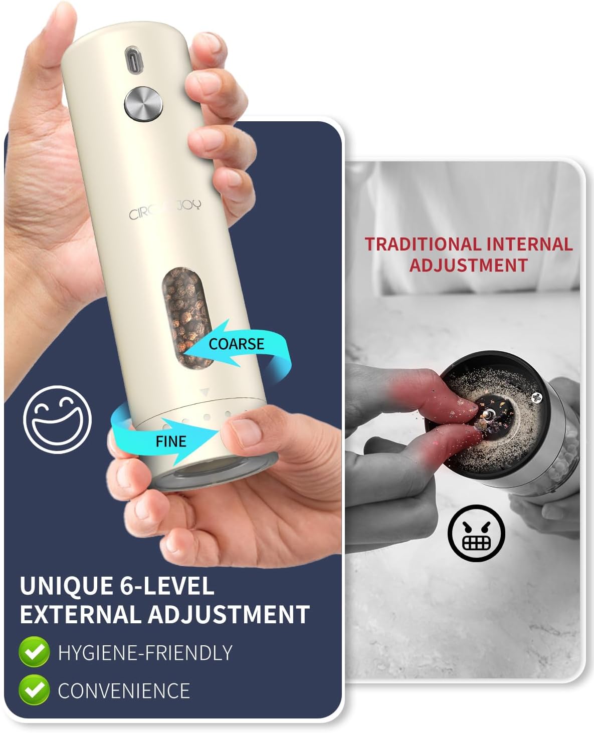 - 【HYGIENE MEETS CONVENIENCE】 - Say farewell to messy, internal adjustments and hello to a cleaner, more hygienic way to tailor your grind. CIRCLE JOY electric pepper grinder boasts an innovative external coarseness adjustment mechanism, allowing you to easily dial in your desired texture without ever having to touch the peppercorns. This keeps your hands clean while in use, making it a great choice for health-conscious cooks
