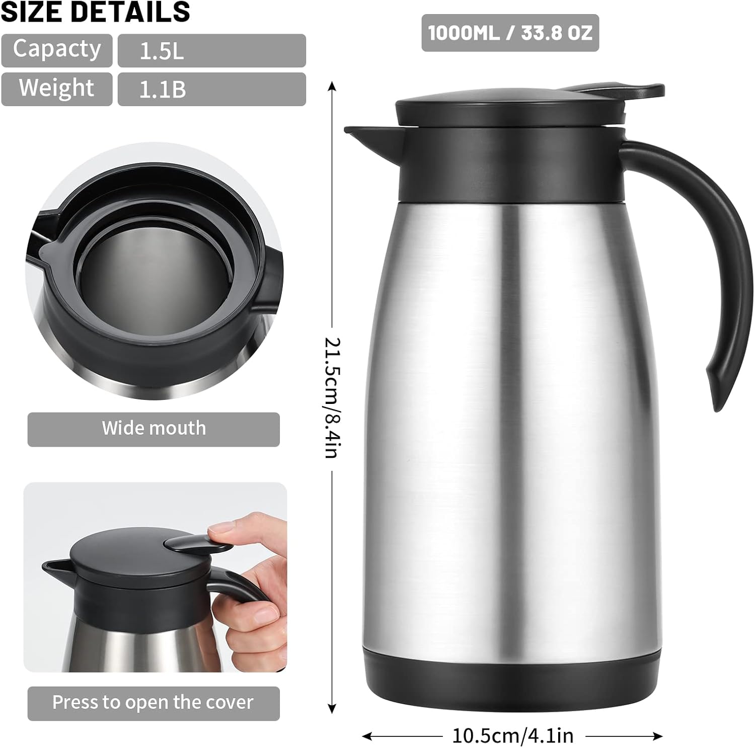 34 Oz Thermal Carafe, Insulated Stainless Steel Coffee Carafes for Keeping Hot Coffee & Tea for 12 hrs and Cold for 24 hrs, 1L/Silver