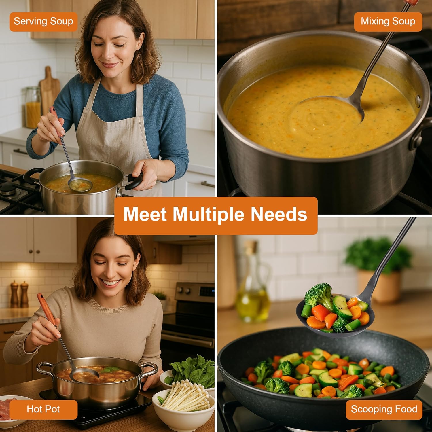 - Ergonomic, Heat-Resistant Wooden Handle: The metal ladel is designed with a comfortable, non-slip grip and heat-resistant handle, and it offers safe and effortless serving, even when handling hot liquids straight from stovetops or ovens.