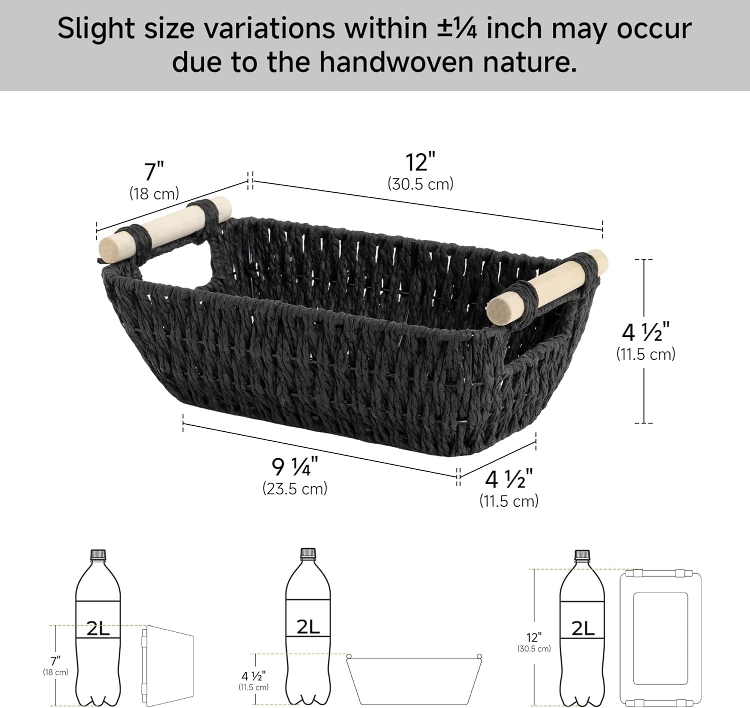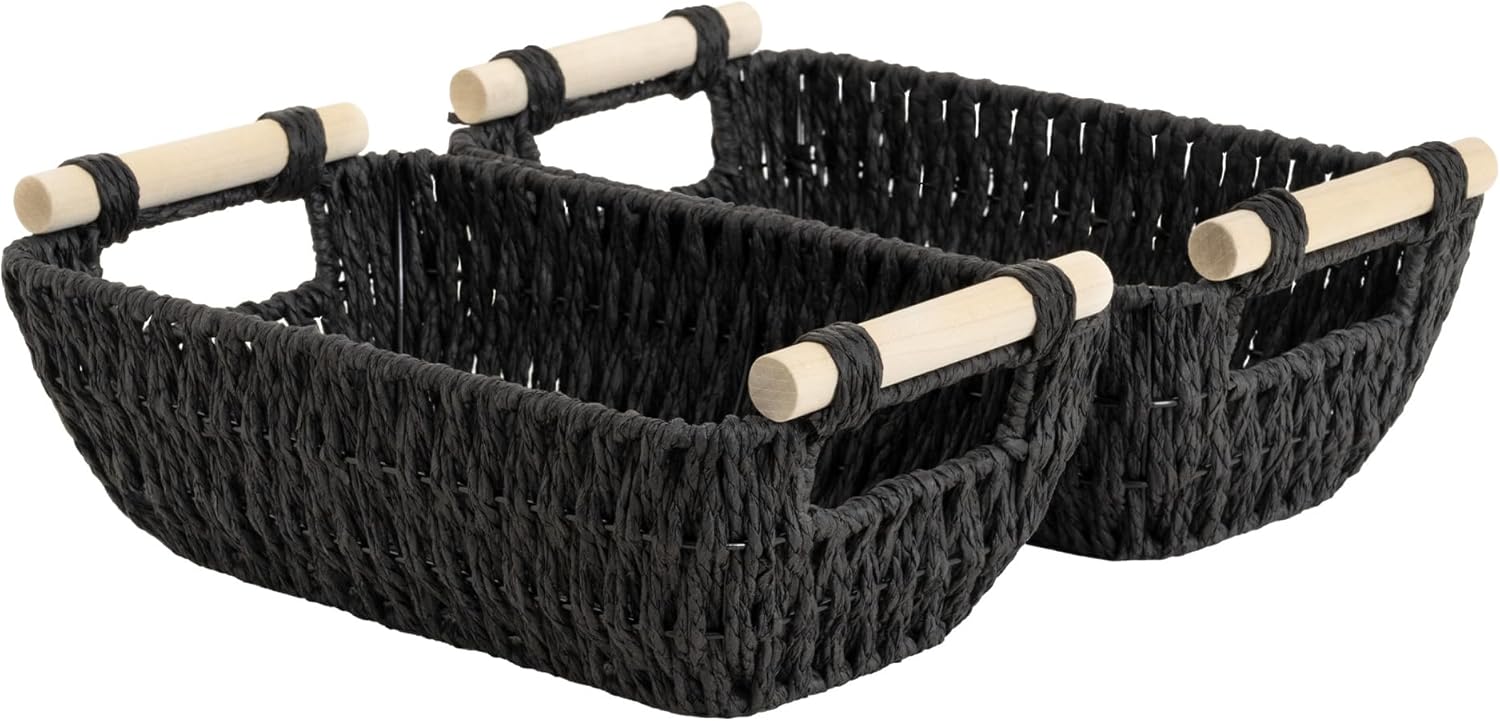 StorageWorks Black Wicker Storage Basket for Organizing with Wooden Handles, Small Woven Basket for Bathroom, Toilet Paper, 2-Pack